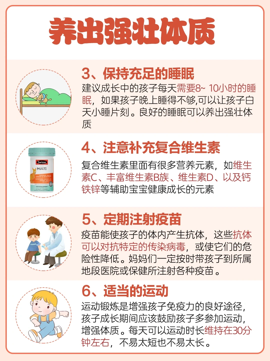 建议成长中的孩子每天需要8~10小时的睡眠,如果孩子晚上睡得不够,可以让孩子白天小睡片刻。良好的睡眠有助于养出强壮体质