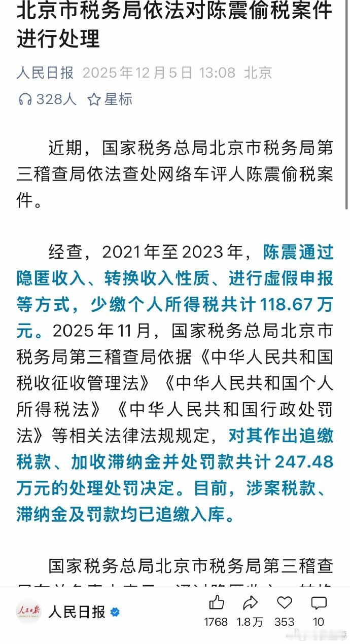 央视、人民日报、新华社都公示了陈震偷税案 看来是没有任何机会了[汗]