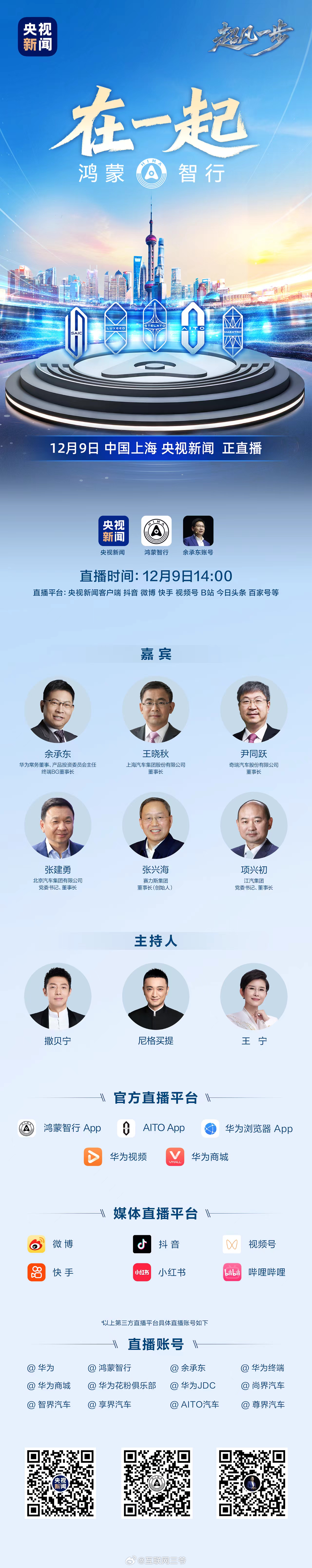 鸿蒙智行五界首聚直播鸿蒙智行年度直播 12月9日14:00,鸿蒙智行与央视新闻联袂带来新闻纪实栏目《超凡一步|在一起,鸿蒙智行》,主持人撒贝宁、尼格买提、王宁对话鸿蒙智行大咖们,看了下嘉宾阵容,阵容非常强大啊,余承东携手五界共同出席,共同探讨中国汽车从追赶到引领的破界之路。