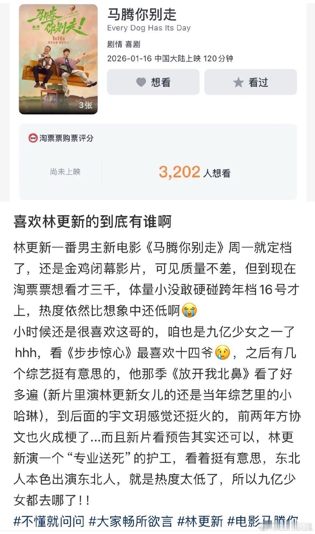 林更新也变成时代的产物了谁懂啊!林更新《马腾你别走》想看数据太意外!金鸡放映获好评,中年废柴的鲜活演绎超吸睛,国民度拉满的他,九亿少女快回来撑场!