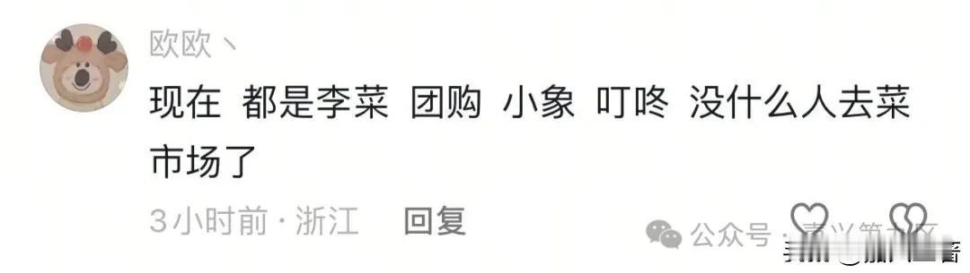 曾经热闹的菜场, 没想到如今也是冷冷清清? @第九区网友爆料: 嘉兴有一家菜场, 里面的熟食店好几家都不开了, 招牌还在, 店里都长了蜘蛛网了! 而菜场里面摊位很多也是空着的, 以前是一摊难求, 现在是摊位都租不出去! 天天要吃饭, 为什么会觉得菜场生意也不好了? 有人说: 菜场不仅价格贵, 还看人报价! 有人说: 现在能买菜的地方太多了, 菜场多、生鲜店也多, 还能团购、网购送到家的! 有人说: 批发来的蔬菜储存几天都没问题, 自己家种的蔬菜1天就不行了, 很多人选择买健康的蔬菜去了! 还有人说: 现在的年轻人都点外卖了, 谁还去买菜! 对此你怎么看? 评论区说说!