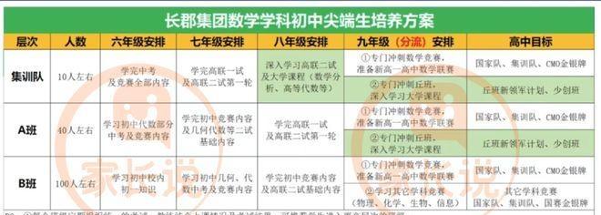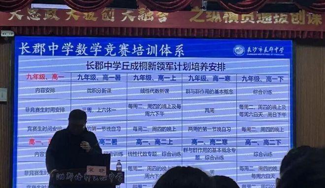 长沙市长郡中学? 长沙长郡中学录取分数线是多少? ------------------------------------ 近日,湘郡培粹校园开放日上,长郡化学竞赛主教练进行了《拔尖创新人才贯通培养的长郡实践与探索》讲座,分享了长郡集团尖端生源的贯通培养模式。 1、初中阶段 长郡集团数学尖端生培养方案三年来几乎没有变化,可见其培养体系经过多年打磨,已经形成一套比较成熟的分层培养模式,该体系通常将学生分为三个层次进行针对性培养,具体方案见下图: 2、九年级-高二 九年级,长郡会对数学尖端生进行分流,竞赛生会继续延续数学竞赛培养体系,非竞赛生会转向冲刺丘班的培训体系。 长郡中学为走丘成桐新领军计划的学生制定了专门培养安排。培训周期从九年级延伸到高二。学习内容围绕新领军计划涵盖的微积分、线性代数、群与群的作用三大高等数学板块进行系统训练。 这个安排计划对不同学段(寒暑假、学期内)及学生类型(竞赛生和非竞赛生)制定了详细的学习与时间安排。对于“非竞赛生”,寒暑假安排几周时间来集中学习,学期内则利用晚上与周末时间上课;竞赛生的主要精力还是在学科竞赛上,丘成桐领军计划培训主要安排在晚上进行,保证两者兼顾。 综上所述,长郡集团的数学尖端生培养,是贯穿小学、初中、高中的一体化设计。 这种早发现、系统培养、学段贯通的模式,不仅为学生打下坚实基础,更通过清晰的路径规划,让不同层次的拔尖学生找到适合自己的成长方向。