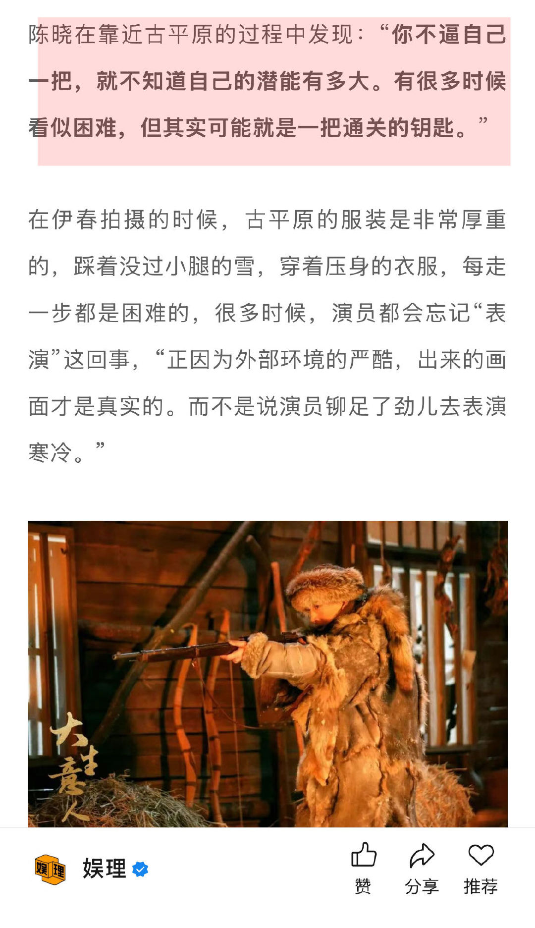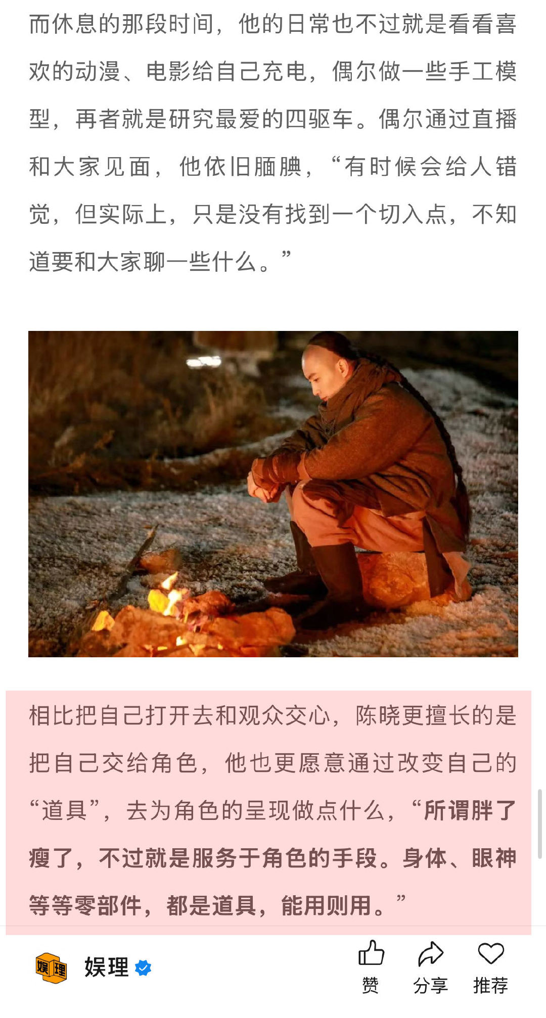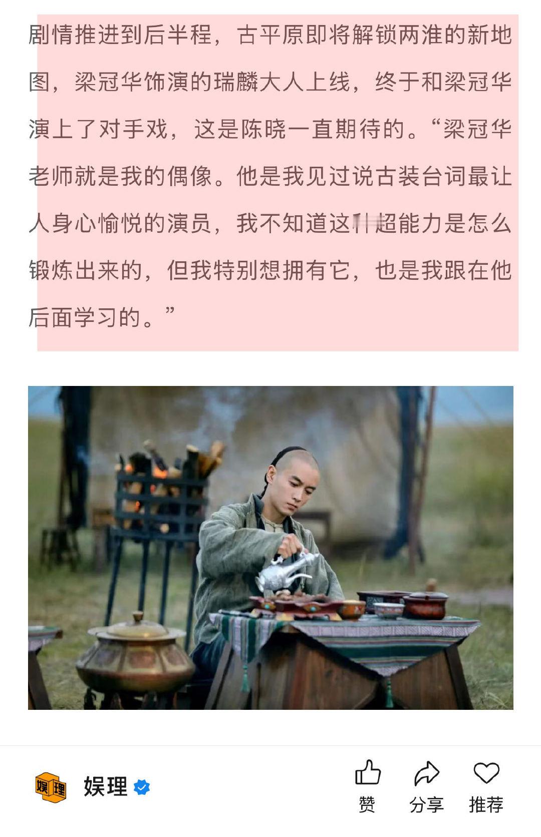 陈晓说身体眼神是服务角色的 陈晓回应被说有书生气 很开心能在《大生意人》中和梁冠华演上对手戏,“梁冠华老师就是我的偶像。他是我见过说古装台词最让人身心愉悦的演员,我不知道这种超能力是怎么锻炼出来的,但我特别想拥有它,也是我跟在他后面学习的。” 此前在参演《五鼠闹东京》时,陈晓就曾感受过梁冠华的实力,“我当时就特别想要和他演对手戏,但在剧中没有机会。” 陈晓回应瘦好多↓