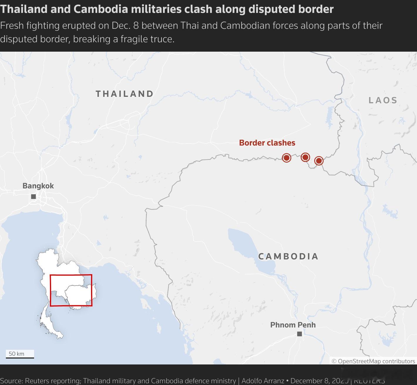 【泰国对柬埔寨发动空袭,边境紧张局势再度升温】(路透社)——泰国周一表示,在两国相互指责对方违反美国总统唐纳德·特朗普斡旋达成的停火协议后,两国在争议边界的多个地区爆发了战斗,泰国随即对柬埔寨发动了空袭。泰国军方发言人表示,当地时间凌晨 5 点左右(格林尼治标准时间 22:00),双方爆发新的冲突,冲突升级,造成至少一名泰国士兵死亡,八名士兵受伤。他还补充说,已调集空中支援打击柬埔寨军事目标。泰国空军表示,柬埔寨已调动重型武器,重新部署作战部队,并准备了支援力量,这可能导致军事行动升级。声明称:“这些事态发展促使我们动用空中力量来威慑和削弱柬埔寨的军事能力。”柬埔寨国防部在一份声明中表示,泰国军方在黎明时分对柬埔寨两处地点的部队发动袭击,此前泰国方面已采取数日挑衅行动。声明还补充说,柬埔寨军队没有做出回应。柬埔寨颇具影响力的前长期领导人洪森(现任首相洪玛奈的父亲)表示,泰国军方是“侵略者”,企图挑起报复性反应,并敦促柬埔寨军队保持克制。洪森在脸书上表示:“应对的红线已经设定”,但他没有详细说明。“我敦促各级指挥官对所有军官和士兵进行相应的培训。”据一位省级高级官员透露,迄今为止,已有三名柬埔寨平民在冲突中严重受伤。柬埔寨国防部表示,其部队尚未进行报复。两国之间长期存在的边界争端在 7 月份爆发为为期五天的冲突,之后在马来西亚总理安瓦尔·易卜拉欣和特朗普的斡旋下达成停火协议。10月份,特朗普还在吉隆坡见证了两国签署扩大和平协议。——“爆炸声……轰隆隆”东盟轮值主席安瓦尔敦促双方保持最大限度的克制,并保持畅通的沟通渠道。安瓦尔在X论坛上发帖称:“重新爆发的冲突有可能破坏两国为稳定关系所做的努力。”近几十年来,东南亚国家之间很少发生军事冲突,跨境空袭更是罕见。居住在泰国与柬埔寨接壤的班克鲁阿特县的居民皮切特·波尔科特表示,他从周一清晨就开始听到枪声。“吓了我一跳。爆炸声非常清晰,砰砰!”他通过电话说道。“我能清楚地听到一切。有些是重型火炮,有些是小型武器。”泰国军方表示,泰国四个边境地区的超过 38.5 万名平民正在被疏散,其中超过 3.5 万人已被安置在临时避难所中。在柬埔寨边境,反对派政治家米奇·索万纳拉表示,平民也在远离边境的战斗。“我听到了炮击声,”他在与泰国接壤的奥多棉吉省首府三隆镇通过语音信息告诉路透社。当地政府表示,奥多棉吉省已有超过1100户家庭被疏散。7 月份的冲突造成至少 48 人死亡,约 30 万人暂时流离失所,邻国之间进行了长达五天的火箭弹和重炮交火。——地雷是催化剂之一一个多世纪以来,泰国和柬埔寨一直在其 817 公里(508 英里)长的陆地边界沿线未划定的地点争夺主权。这条边界最早由法国在 1907 年绘制,当时柬埔寨是法国的殖民地。尽管各方曾试图和平解决重叠的领土主张,但这场由来已久的争端仍不时爆发冲突,例如 2011 年持续一周的炮击。今年 5 月,一名柬埔寨士兵在短暂的交火中丧生,此后紧张局势开始升级,并逐渐演变为外交争端和武装冲突。尽管安瓦尔和特朗普在几天内就制止了战斗,并在10月份的地区峰会上巩固了停火协议,但泰国上个月表示,在一名士兵因地雷爆炸致其受伤后,泰国将暂停执行与柬埔寨的停火协议。泰国多次指责柬埔寨在其争议边界沿线埋设新的地雷,自 7 月以来,至少有 7 名泰国士兵因此严重受伤。金边方面否认了这一指控。路透社10月份报道称,根据专家对泰国军方提供的资料的分析,在边境发现的一些地雷可能是新近埋设的。