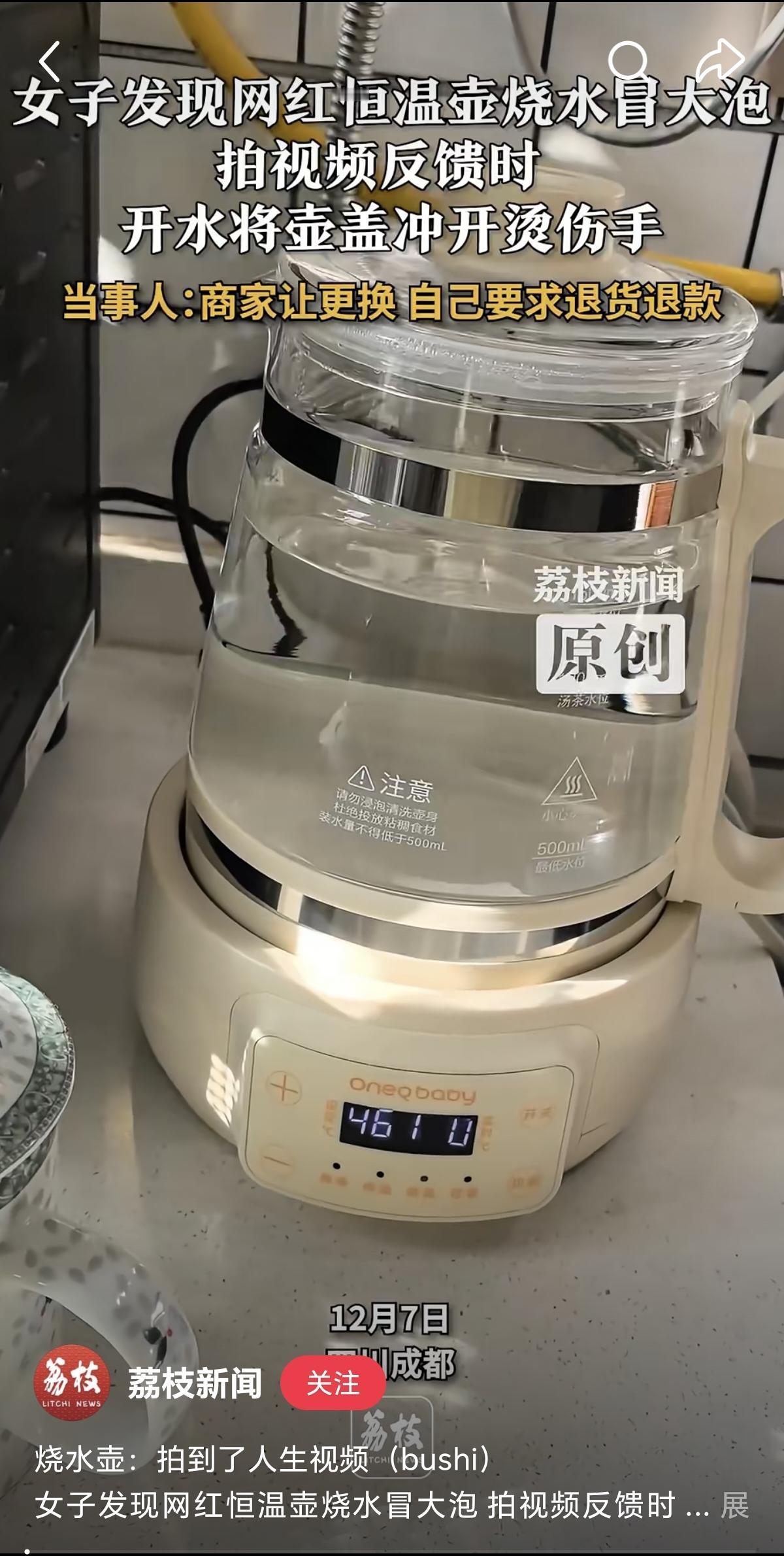 太危险了, 恒温烧水壶在烧水的时候突然炸沸了。 我家里也有这样的烧水壶 用了好多年了,也没有出现过这样的情况 被炸伤的女子认为是烧水壶的问题 坚持要求商家退货退款 不过有网友说这是暴沸,容器和水都太干净了,就容易发生这种情况 简单的说,液体在光滑干净的器皿中加热时,往往需要气泡、水垢等杂质作为汽化的起始点,这被称之为“核”;如果缺少这样的核,液体可能被加热超过沸点,变得很不稳定,可能突然迅速沸腾、形成大气泡。 用玻璃杯和微波炉加热水就很容易出现暴沸现象。 我家用的水壶之所以没有发现这样的情况,估计是因为我烧水的水质里有水垢,看来以后真的不能太勤快清洁水垢。 又学到了一个新的知识!