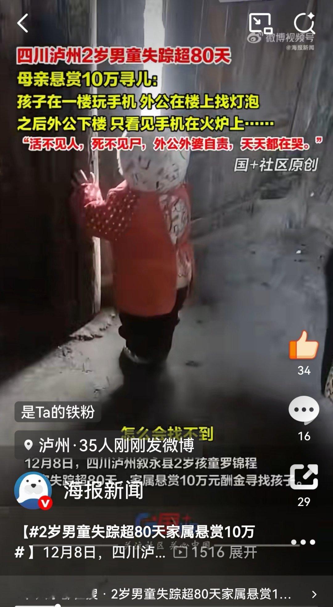 2岁男童失踪超80天家属悬赏10万 但愿孩子能够平安!但失踪了这么多天,希望特别渺茫。看起来不像被拐骗的,除非是亲友作案,不然孩子家在山区谁也不能精准知道身边没人。如果孩子自己走私,山区的草丛和林木比较多,而且河流等危险地方也比较多,很可能就出事了。对年幼的孩子家长一定要看紧!