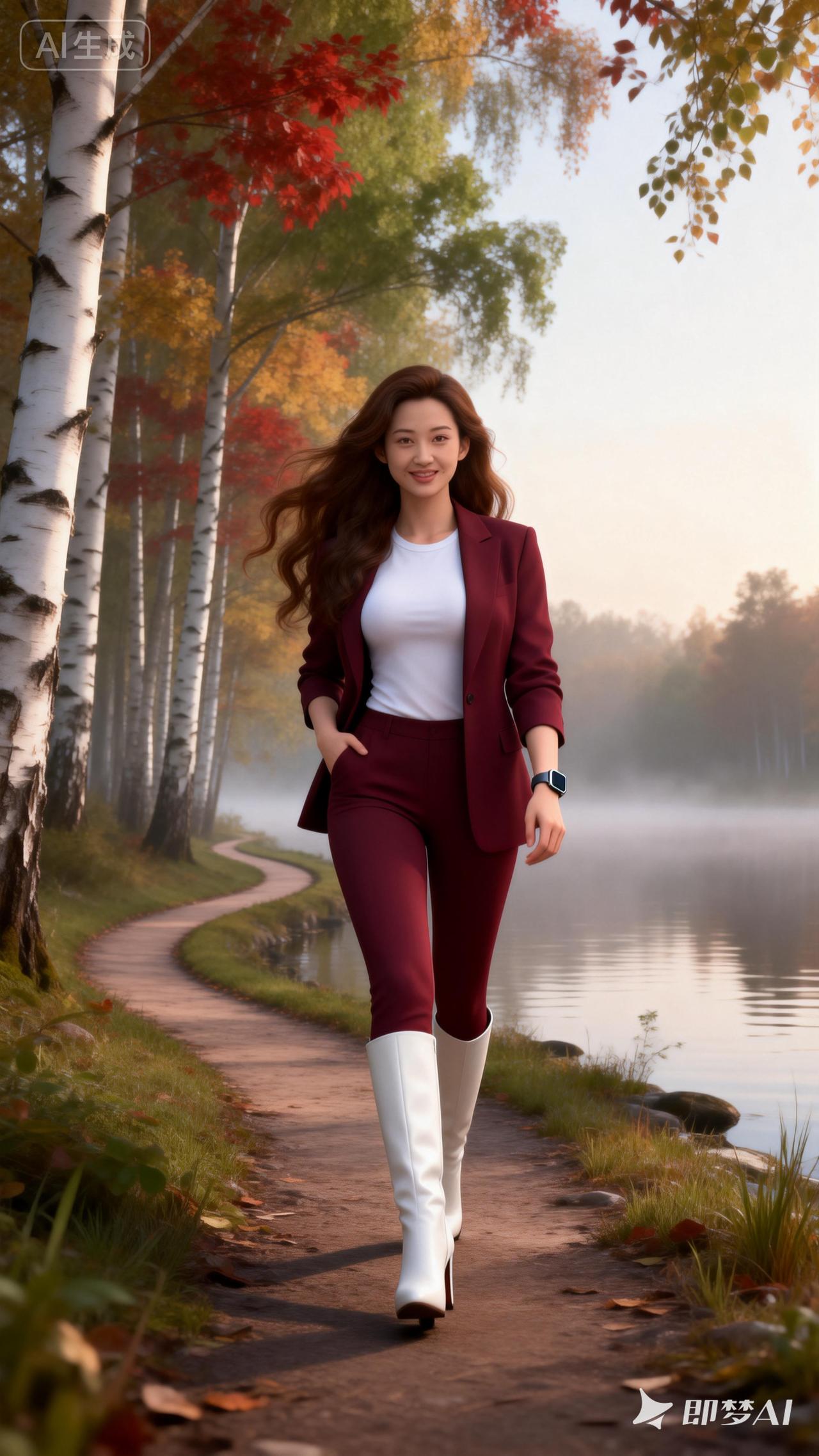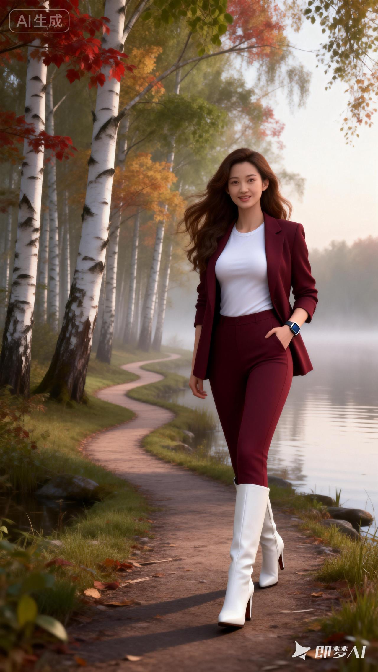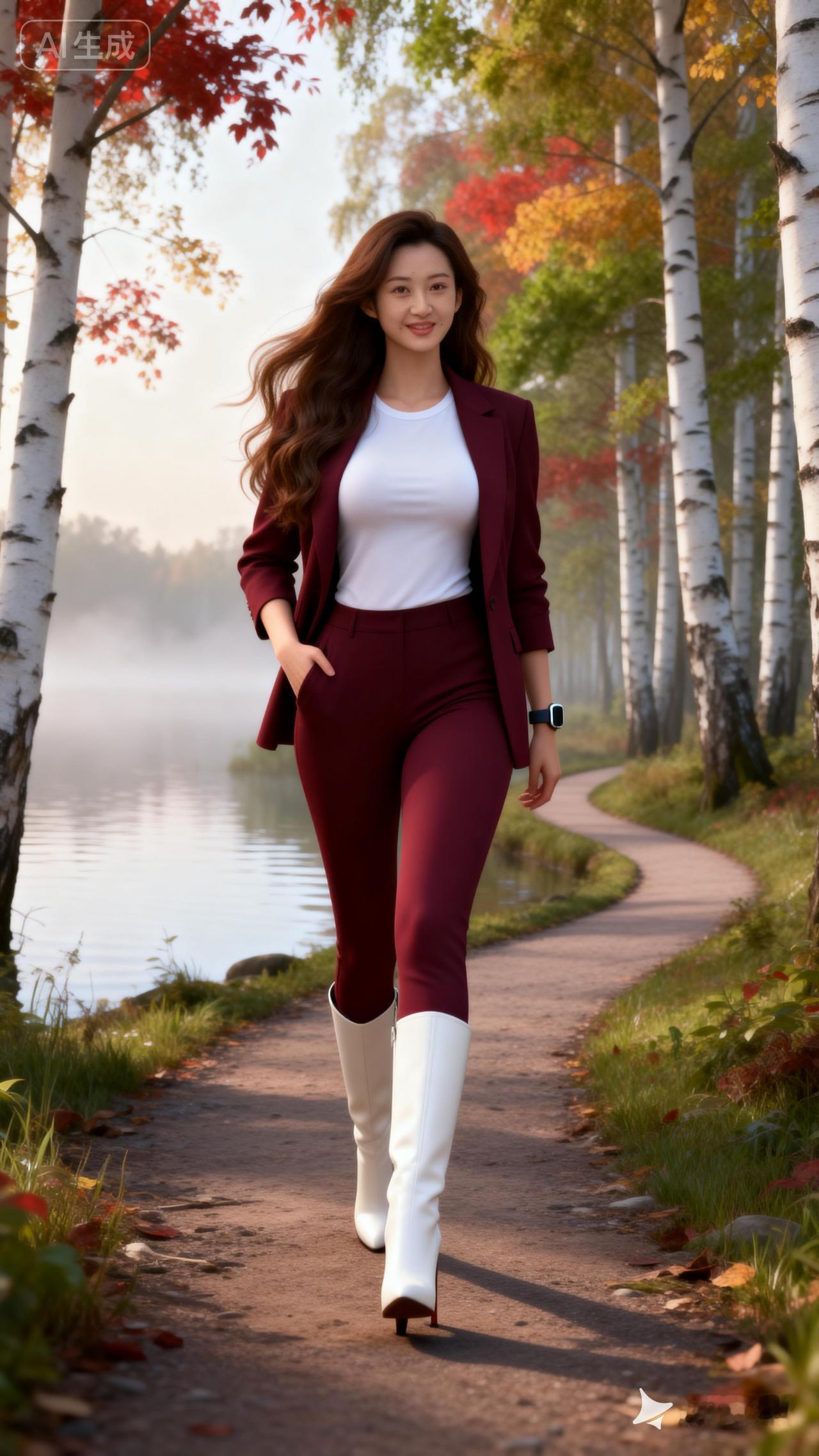 秋日漫步,红衣少女与白靴的完美搭配,尽显时尚与优雅。