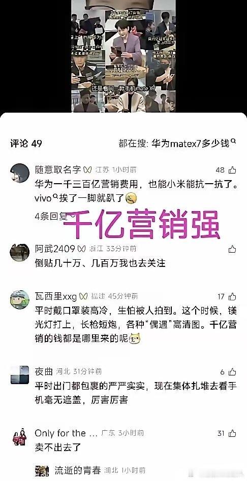 有些人又按捺不住了,说华为千亿营销!今天有些自媒体爆料,好多明星买了华为手机,评论区瞬间炸锅了。有人说这是千亿营销,是年底营销费没花完,一下子全用上了!还说华为倒贴钱让明星买手机!我觉得呢,营销是公司的正常行为,只要不违法不缺德,就都能做!吃瓜群众们,拿好瓜,慢慢看就行!华为加油,中国加油!