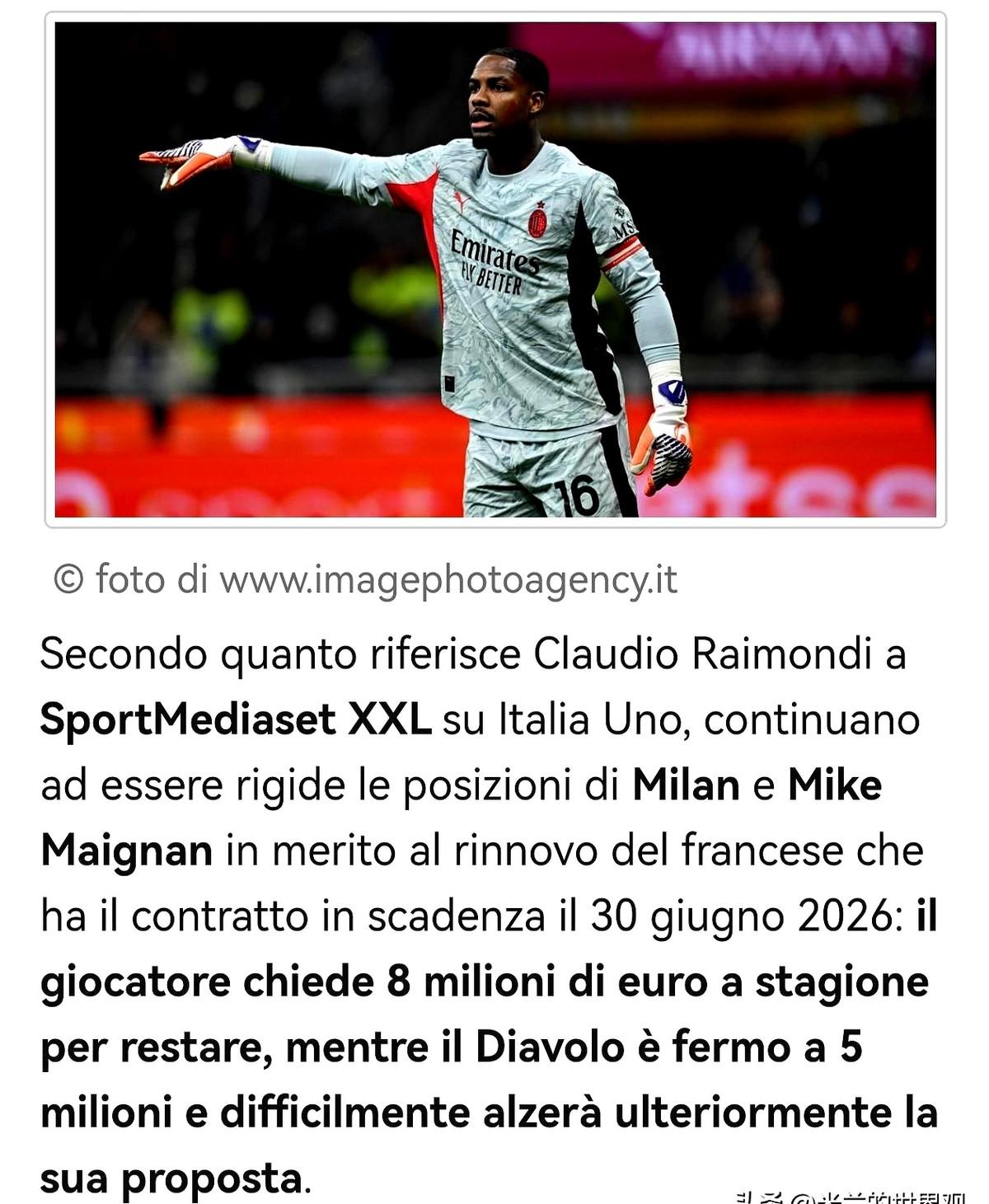 AC米兰这下真头疼了,迈尼昂要800万。 俱乐部咬死500万欧元报价,一步不让。队内顶薪莱奥才700万,给迈尼昂800万,他直接成全队第一高薪,这更衣室咋平衡。米兰这几年好不容易把工资结构控制住,不想再乱来。 迈尼昂要的价高吗?看看市场,库尔图瓦、奥布拉克这些顶级门将,年薪都在600到1000万欧。他觉得自己值这个价。可上赛季他因伤缺了快20场比赛,这个是米兰最犹豫的地方。一个不稳定的玻璃人。 外面还有一堆球队盯着呢。切尔西、曼联这些英超土豪,给得起这个钱。巴黎也在观望,万一多纳鲁马走了,迈尼昂就是个好选择。球员心里有底,不愁下家,这就是他的谈判筹码。 合同2026年才到期,时间还算有。可要是拖到2025年夏天还没续,米兰就得卖人了,总不能白白放走。这事儿啊,这事儿就看谁先扛不住了。 谈判僵局继续,要是没进展,2024年夏窗关于他的转会传闻估计就满天飞了。