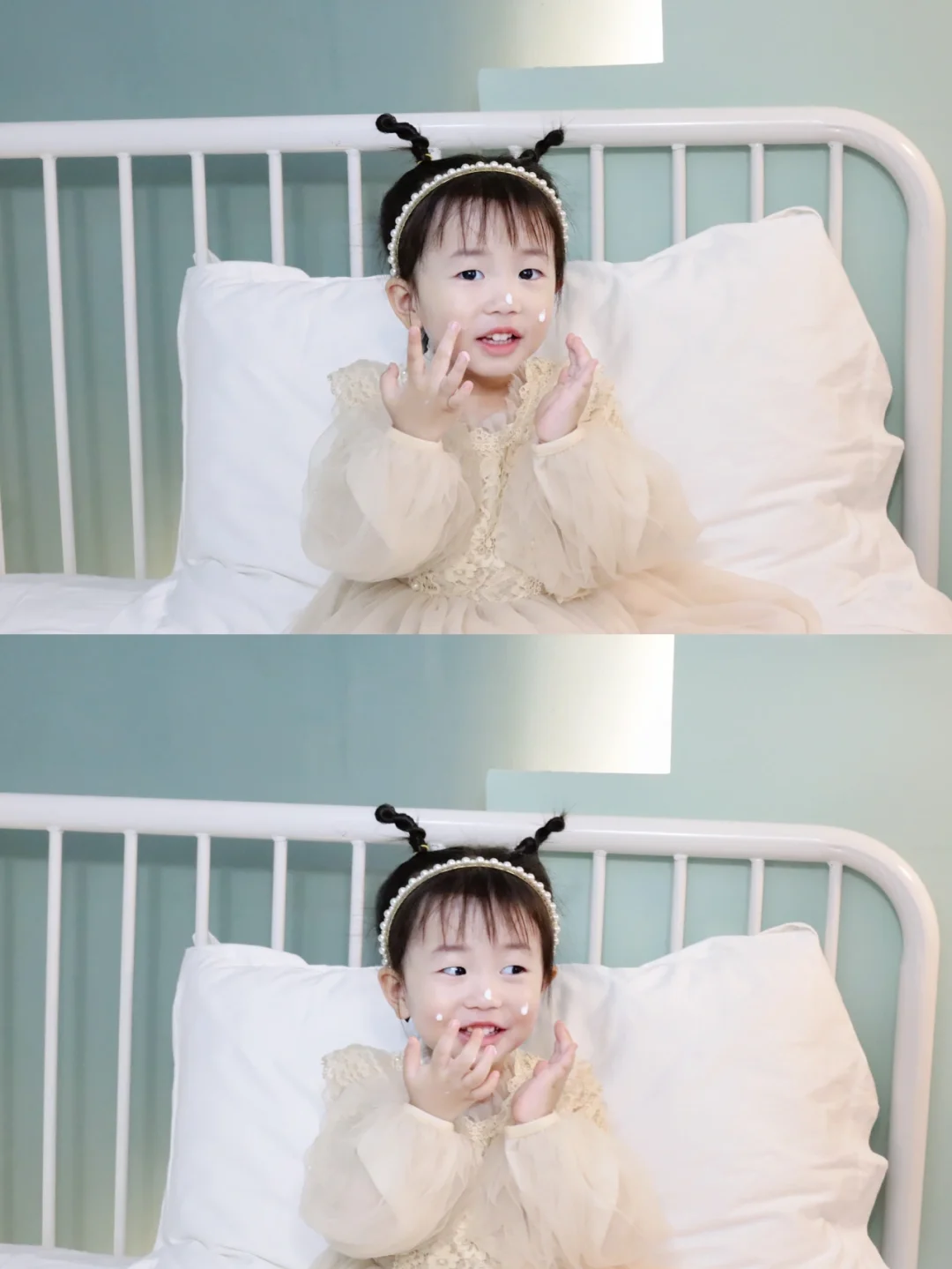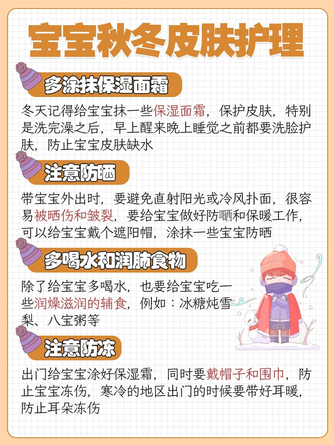 冬天记得给宝宝抹一些保湿面霜,保护皮肤,特别是洗完澡之后、早上醒来晚上睡觉之前都要洗脸护肤,防止宝宝皮肤缺💧