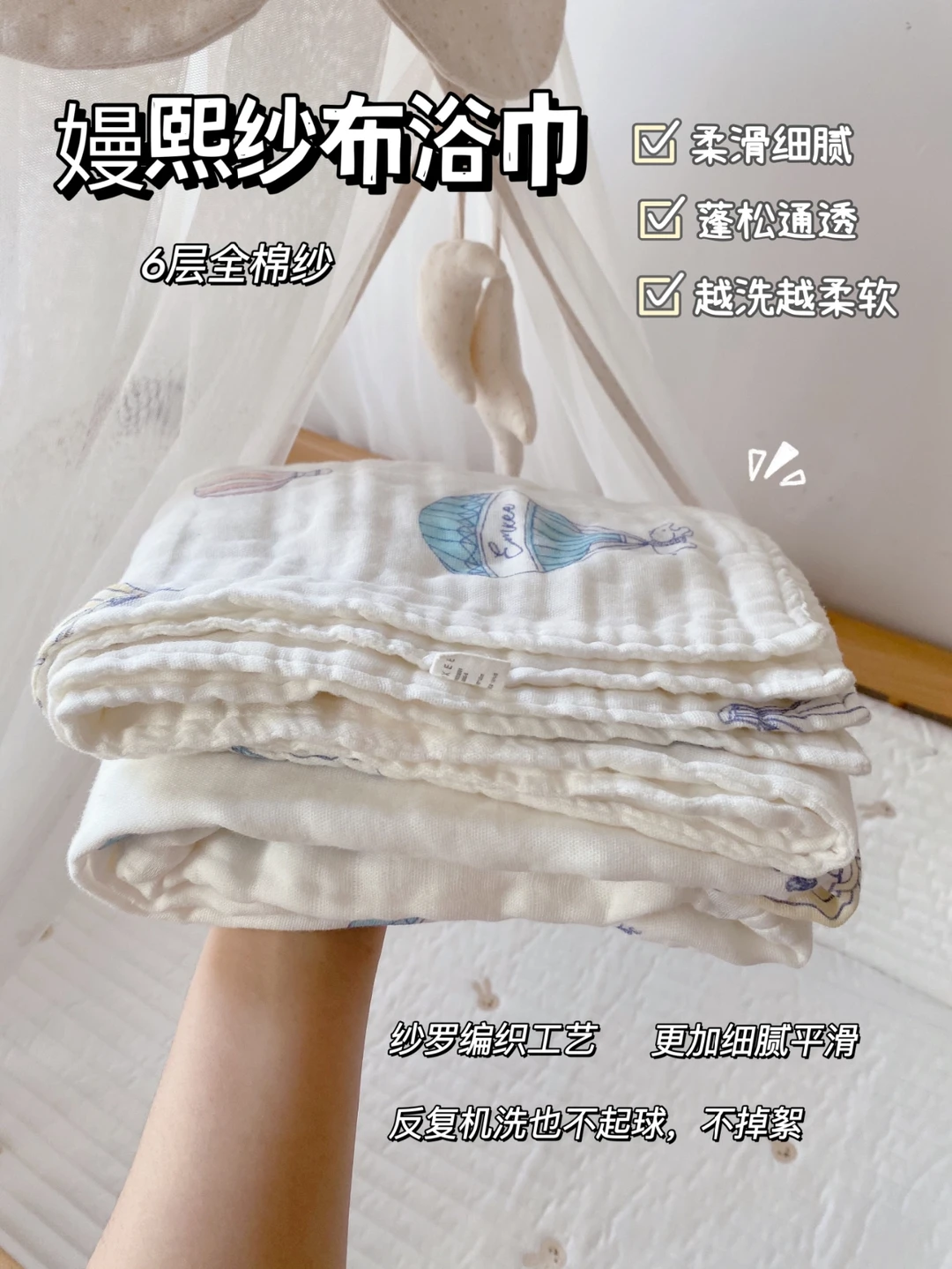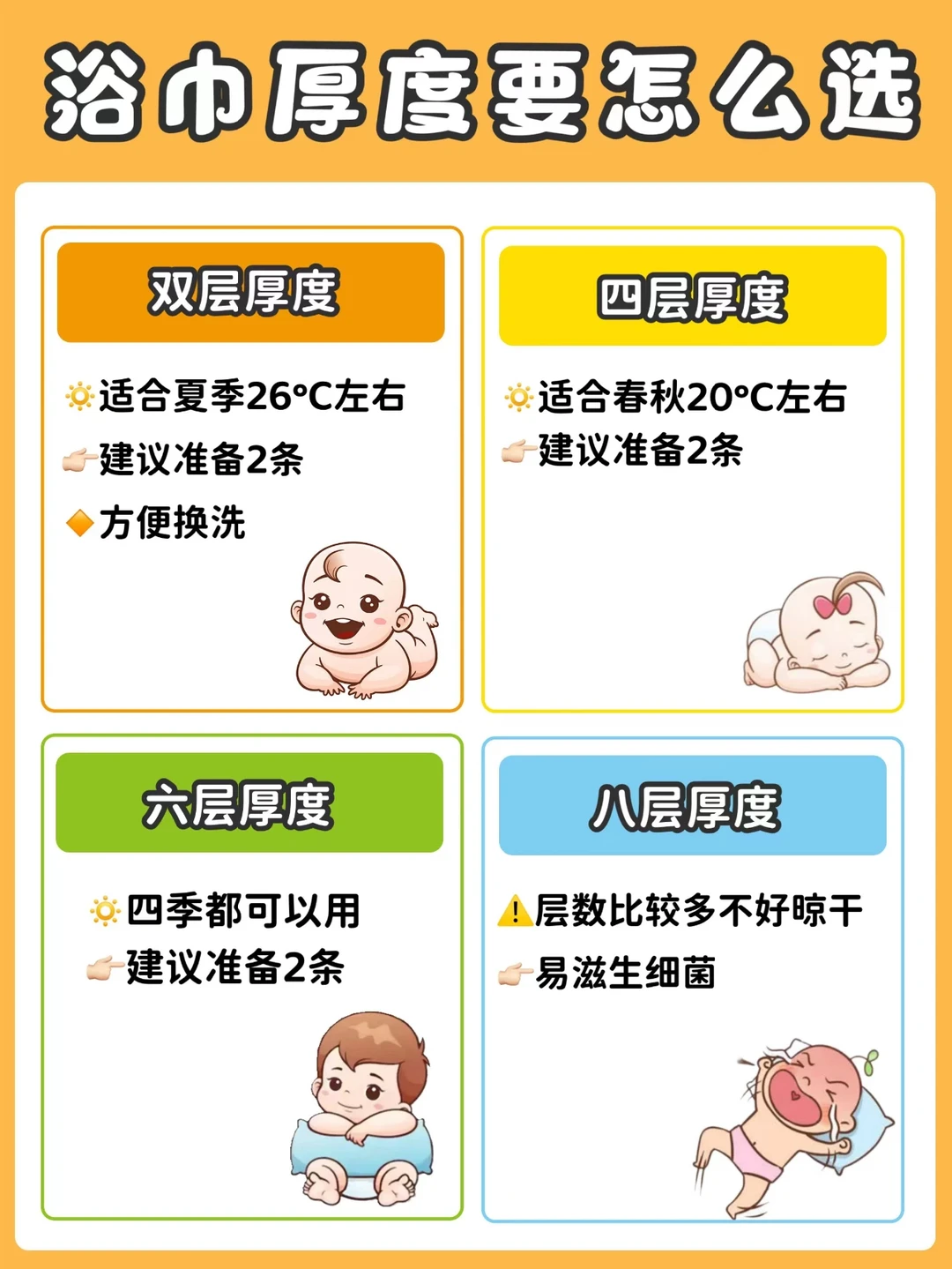 🔸六层:厚实一点,更吸水,适合做浴巾或当襁褓都妥妥够用!囤两条即可。