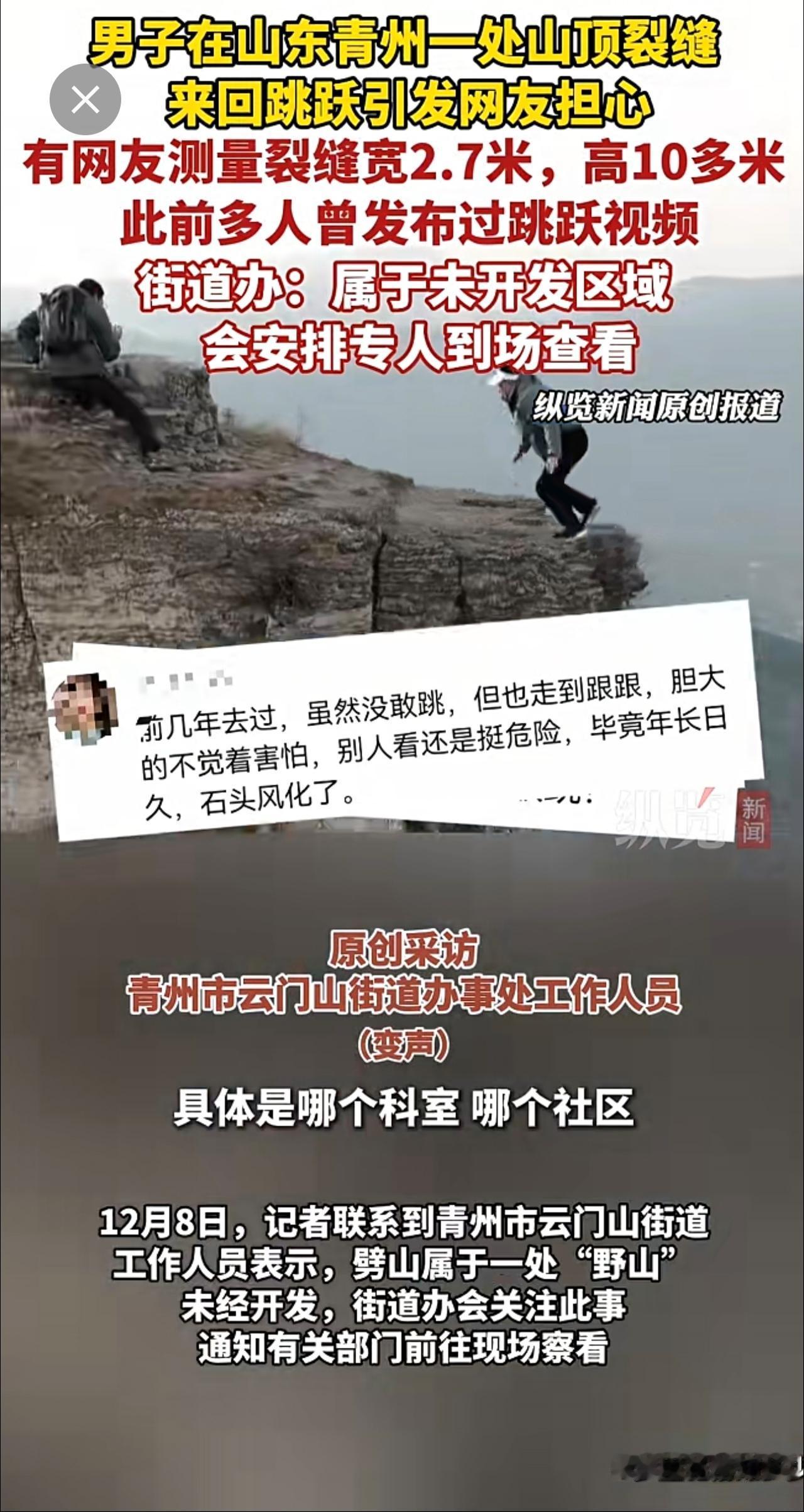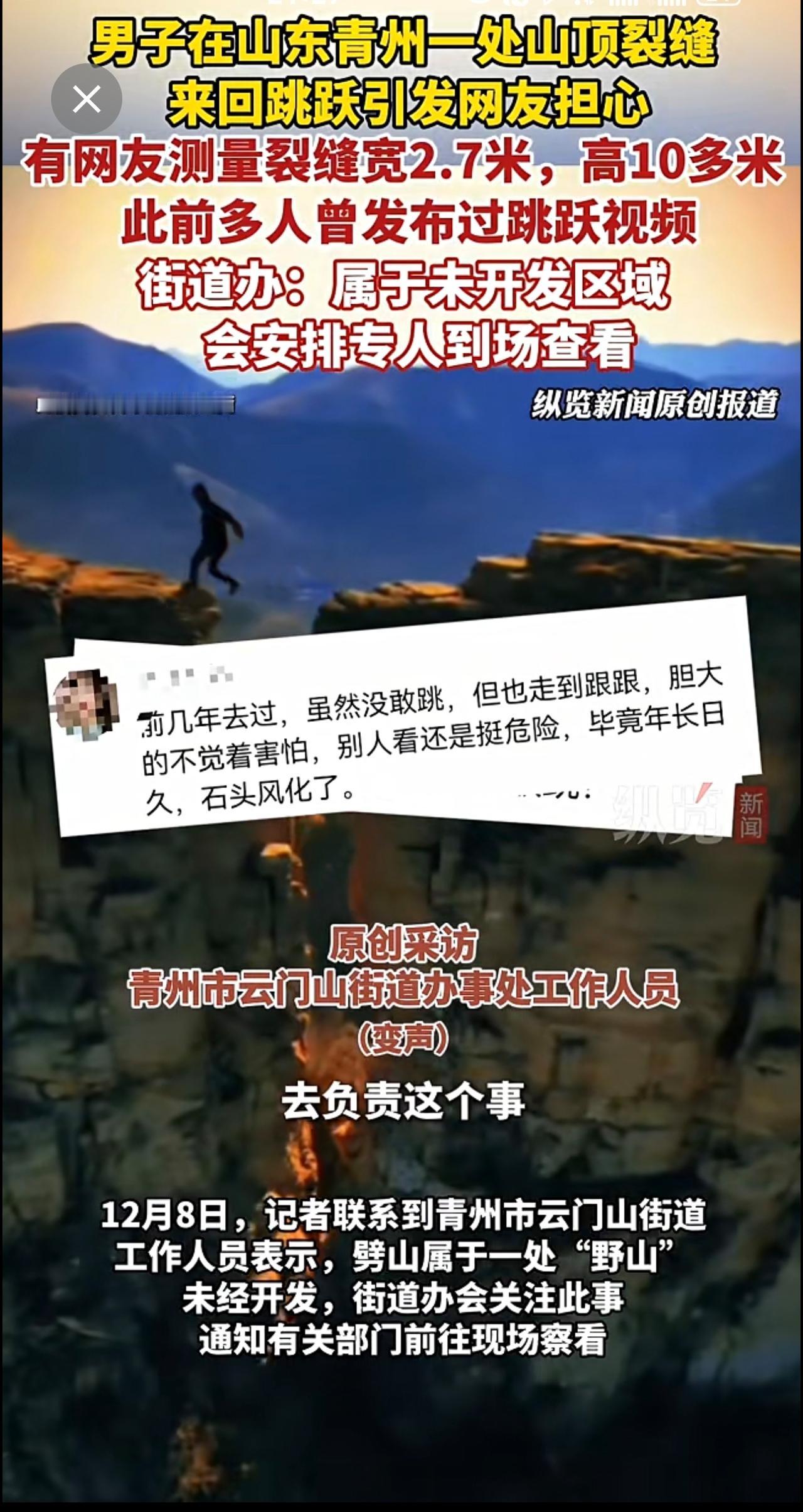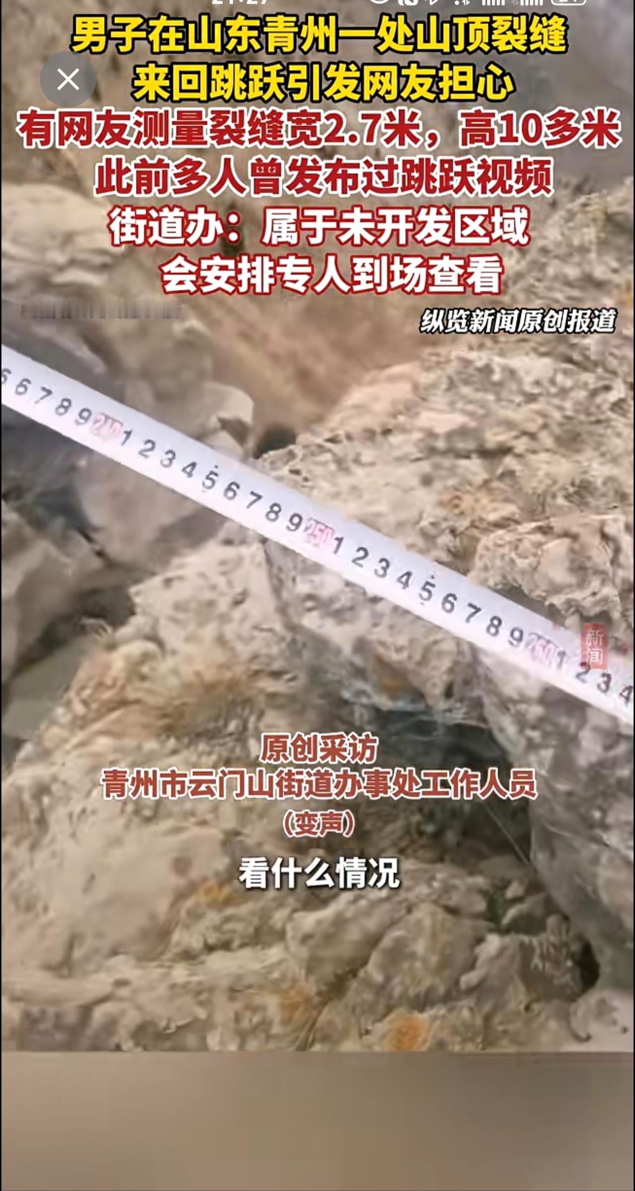 纵览热点|男子在山东劈山山顶近3米宽裂缝间反复跳跃被指“太危险”,此前多人曾发布过跳跃视频,街道办:属未开发区域,将到场查看。
