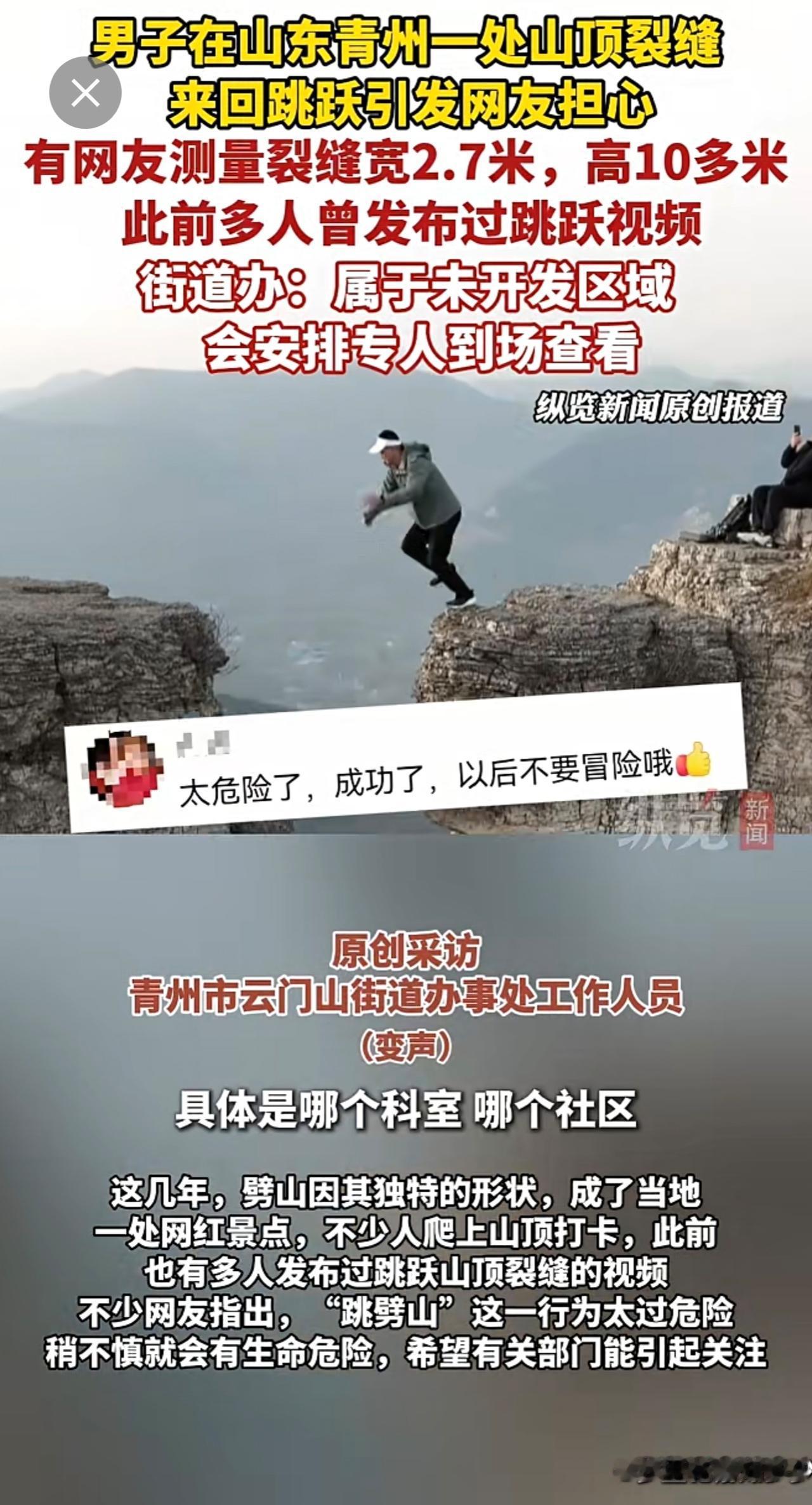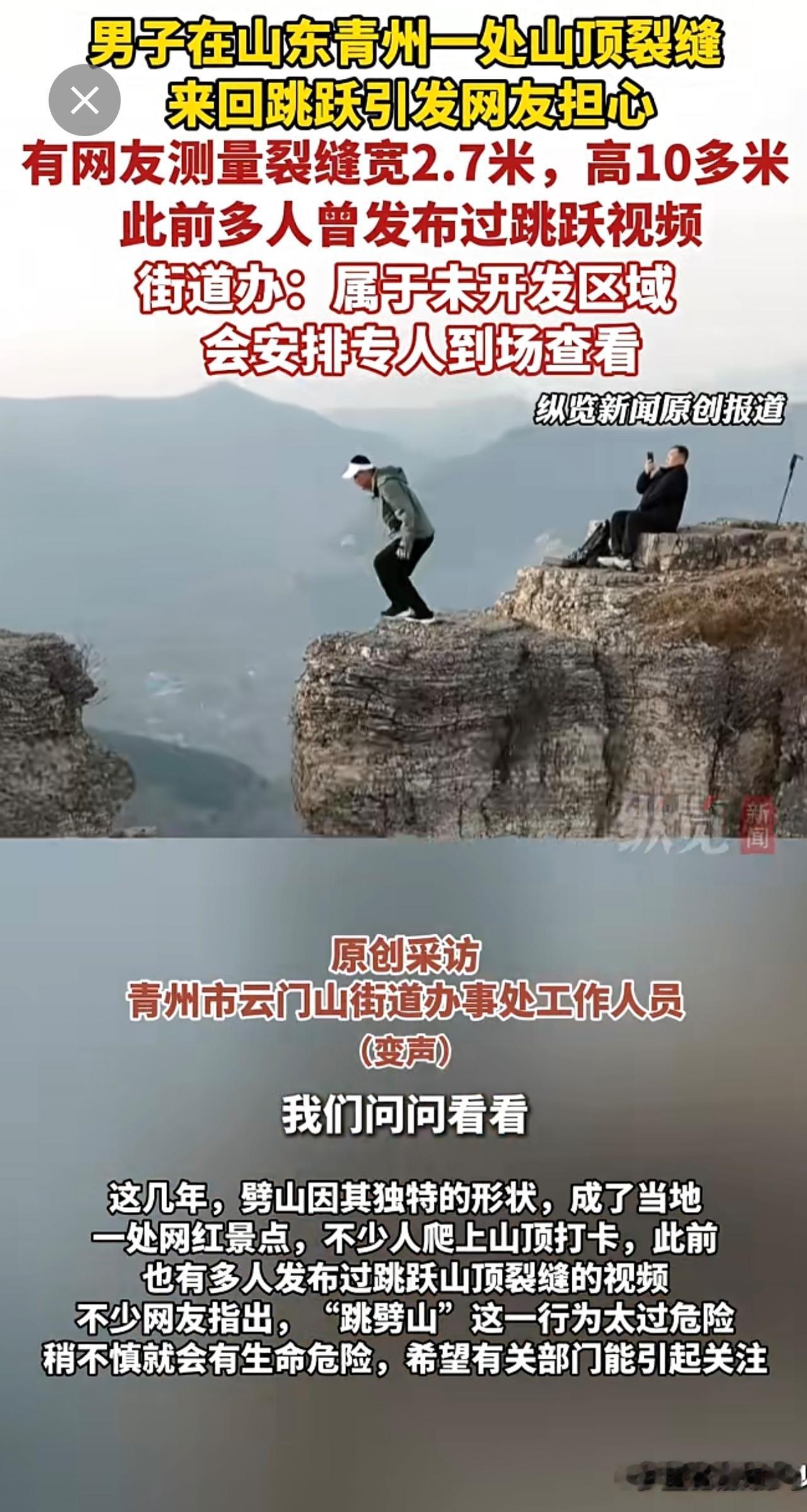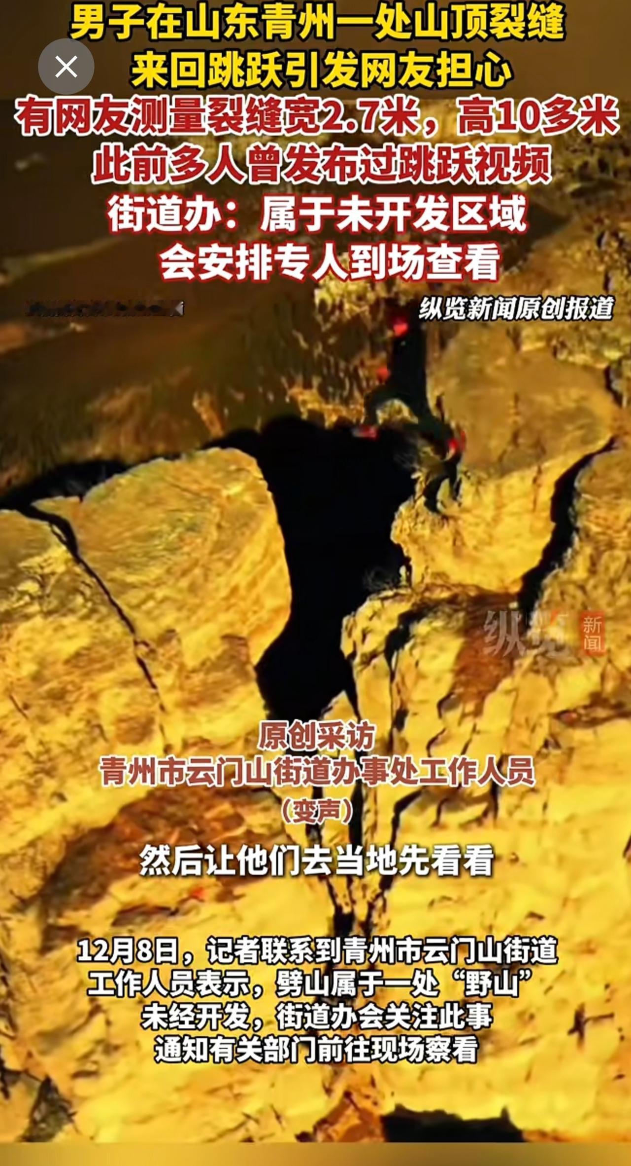 纵览热点|男子在山东劈山山顶近3米宽裂缝间反复跳跃被指“太危险”,此前多人曾发布过跳跃视频,街道办:属未开发区域,将到场查看。