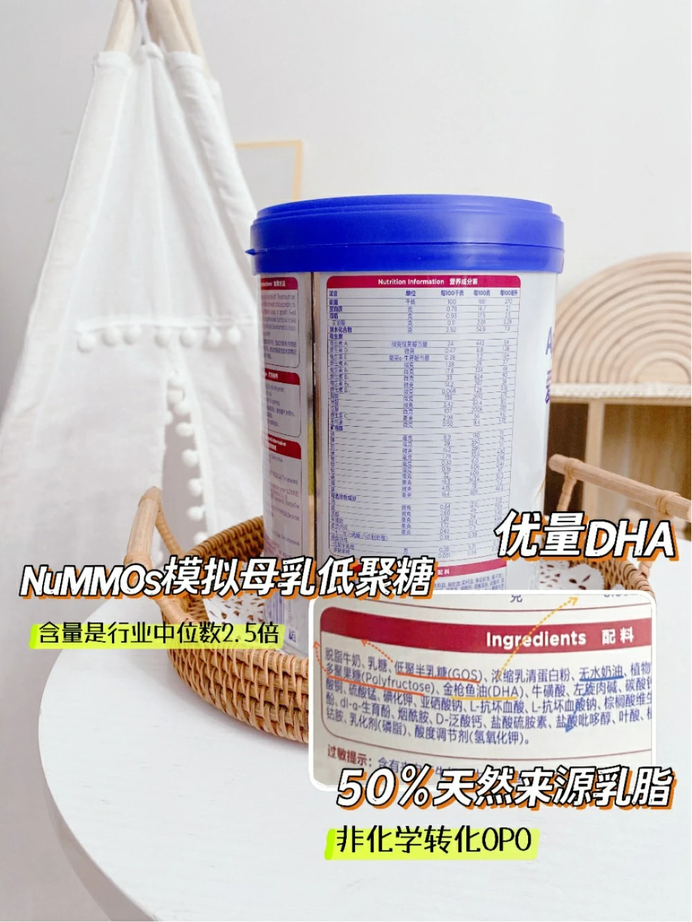 125年科研历史背景,NuMMOs模拟母乳低聚糖的含量高,达到行业中位数2.5倍,提高宝宝自身免疫力,帮助增强体质。50%天然来源乳脂帮助宝宝提升对钙、锌等关键营养素的吸收,有利于宝宝长肉肉。另外DHA含量也达到了欧盟标准,促进宝宝大脑和视力发育,全乳糖成分在同类产品中属于很接近母乳的奶粉。