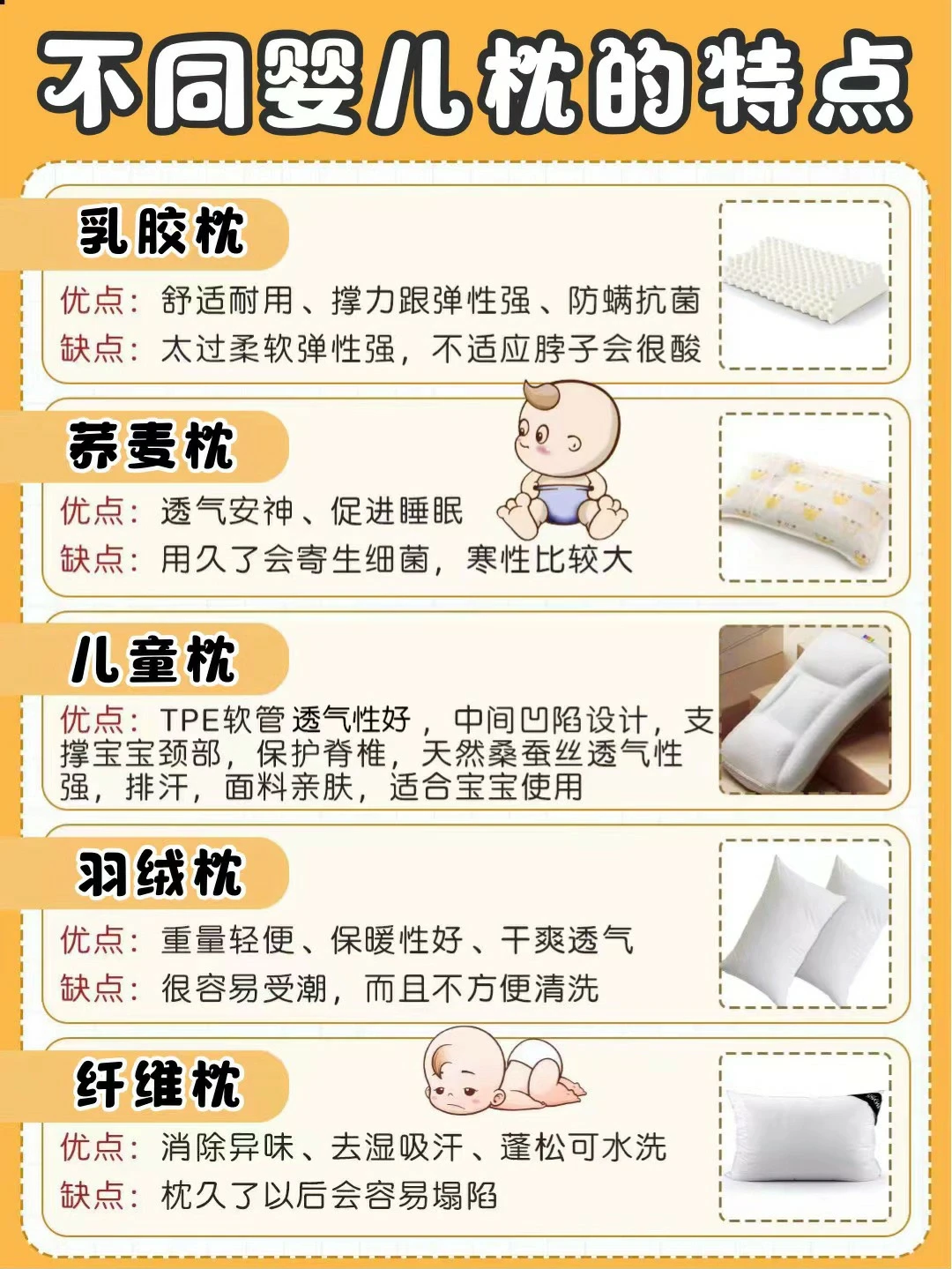 宝宝枕头的款式五花八门,比如荞麦枕、羽绒枕、乳胶枕等等,在挑选时我还专门做了功课,在图片中列举了他们的特点,宝妈们可以参考。