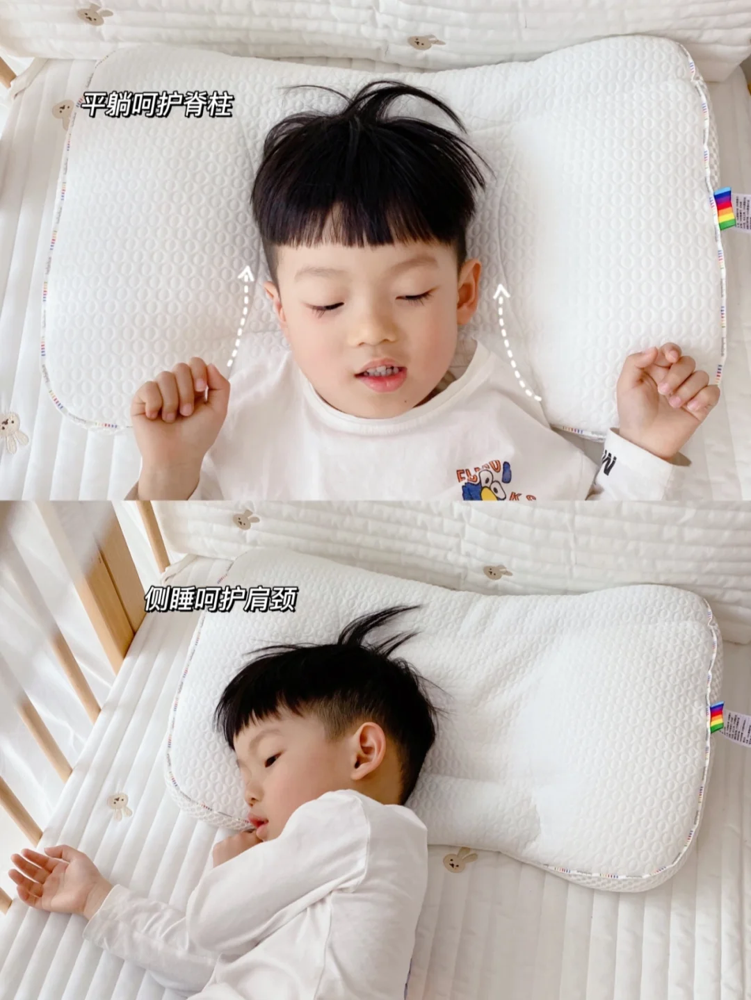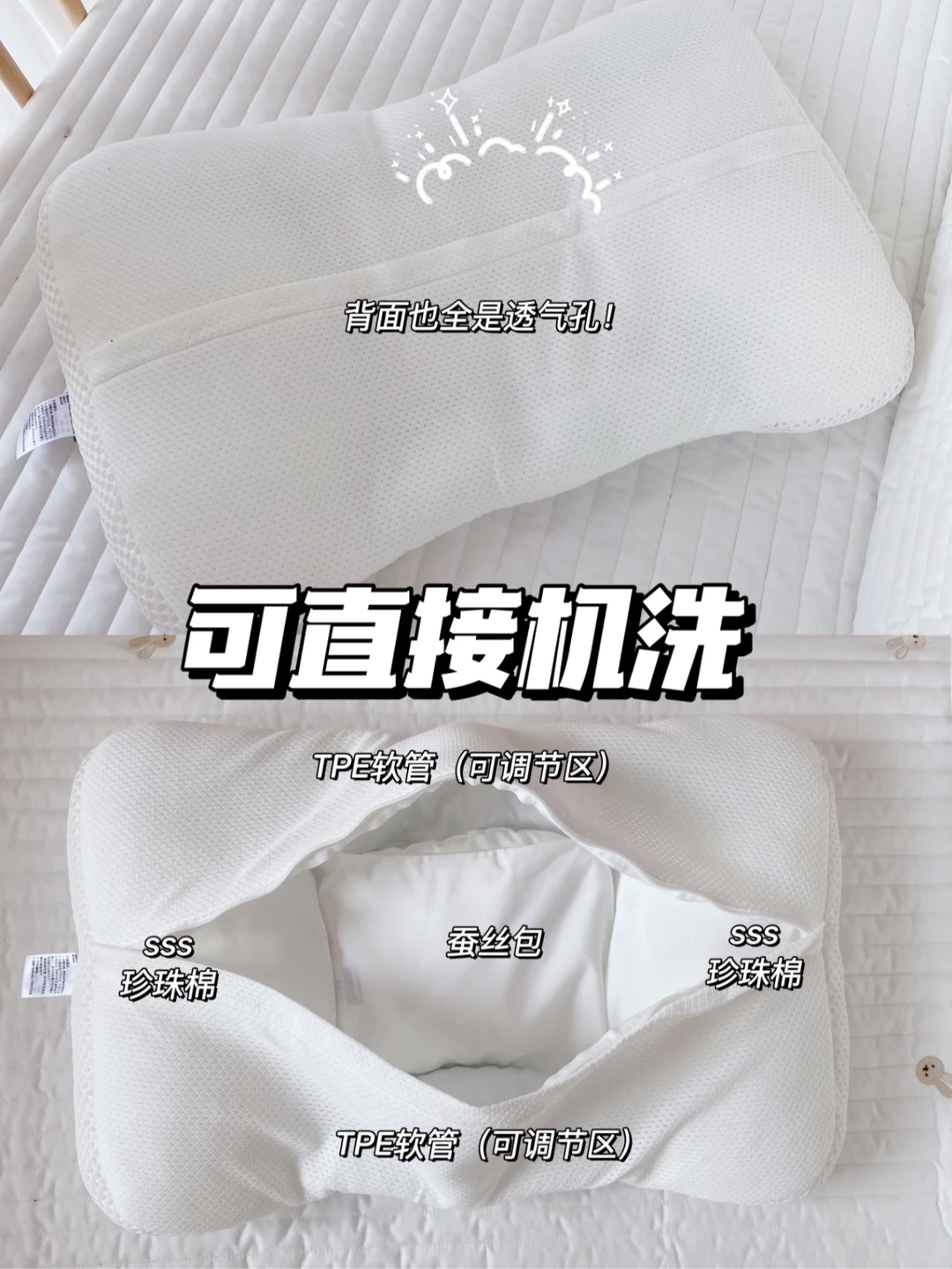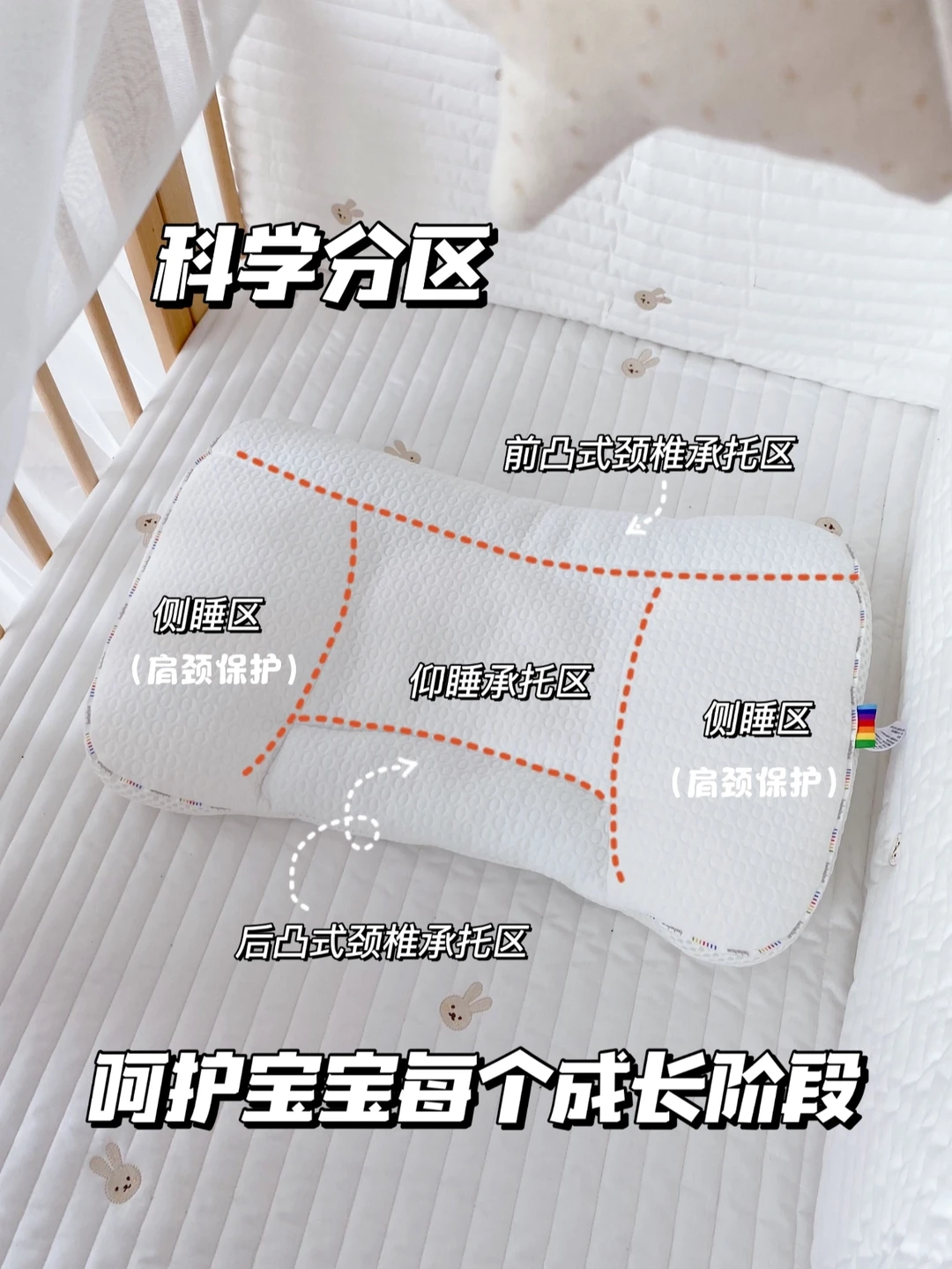 枕头根据不同受力点,科学分出了5个分区,无论宝宝平躺还是侧睡,都能呵护到娇嫩的脊柱!内部由3种不同材质填充(蚕丝+sorona纤维+TPE软管),透气又柔软螨,宝宝睡起来踏实不闷汗,宝宝一整晚都在枕头上,分区功能很强大!一觉轻松到天亮!👍
