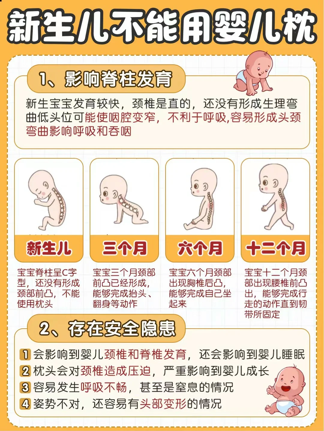 很多妈妈问新生儿能用枕头吗?🤔像很多老人家喜欢给新生儿垫枕头,其实大错特错,因为👶🏻脊柱呈C字型,还没有形成颈椎、胸椎等生理突出,所以千万别乱用枕头!