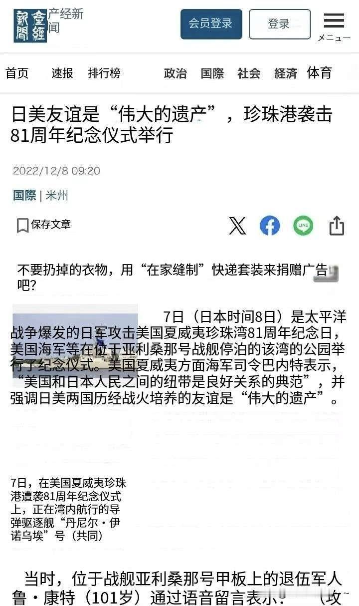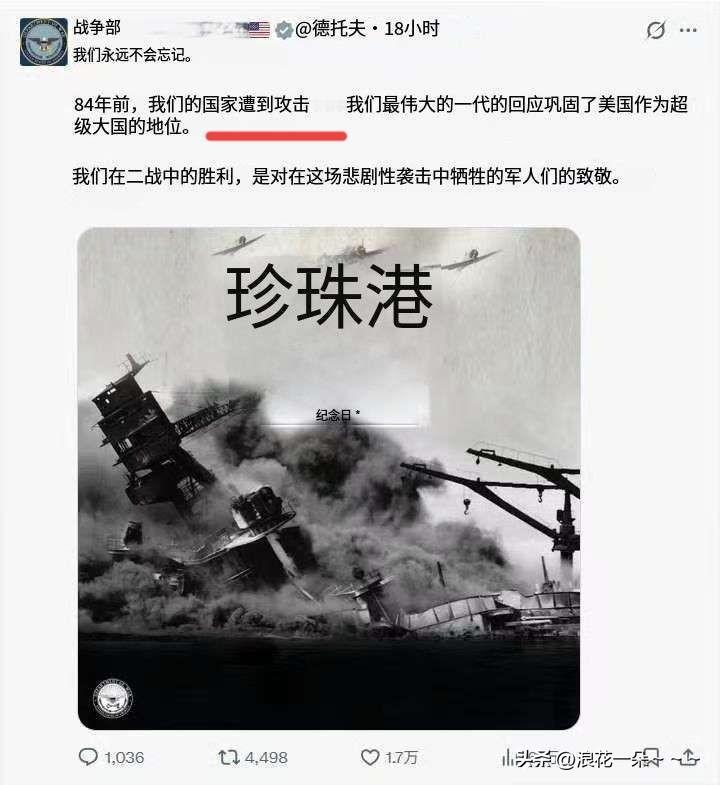 看看吧! 美国也就剩这点出息了?[击掌] 珍珠港被偷袭,美国永远不会忘记,但是,只字不提被日本偷袭的,难道是心里还很惊悚吗?是怕被鬼子羞辱吗?[捂脸] 再看看日媒怎么写的?——日本攻击美国夏威夷珍珠岛81周年纪念日。 既然美国这么害羞要脸,那么,就给他回顾一下历史吧:1941年12月7日(当地时间清晨),日本海军对美国珍珠港发动突然袭击,这一事件直接导致美国次日对日宣战,正式加入第二次世界大战。