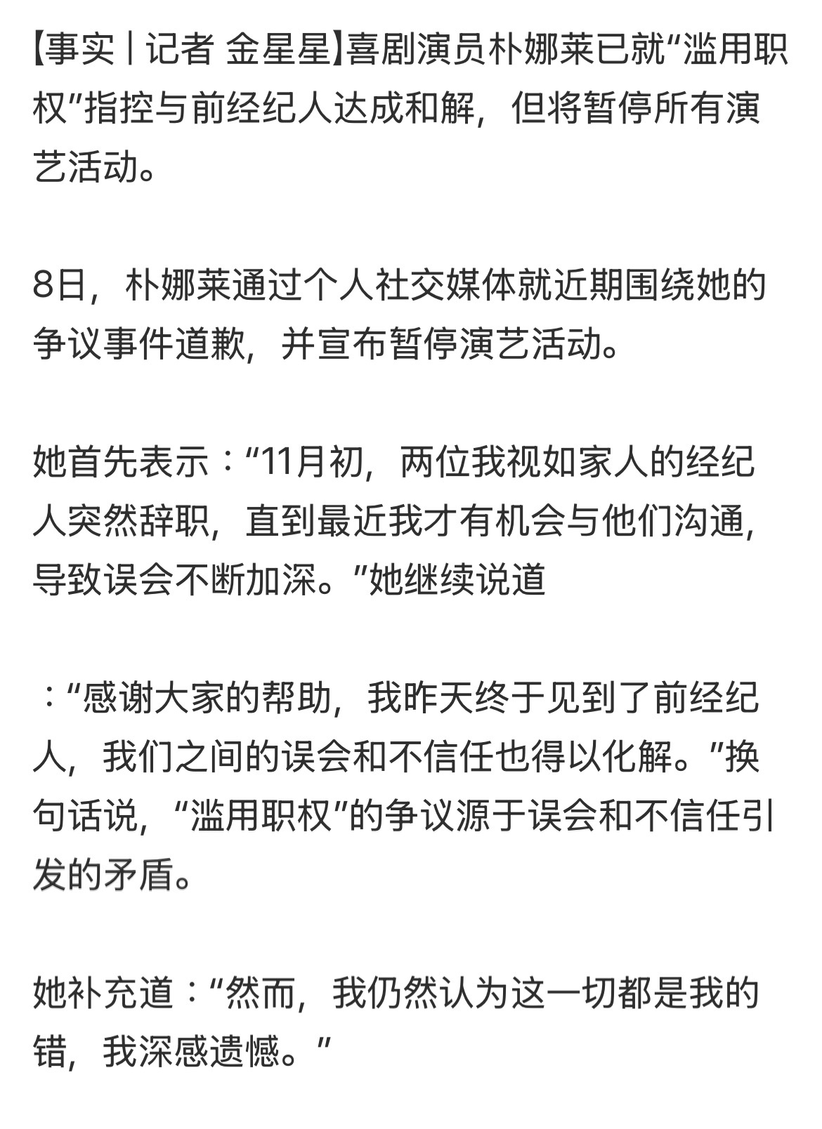 朴娜莱宣布暂停演艺活动朴娜莱暂停活动朴娜莱宣布暂停活动