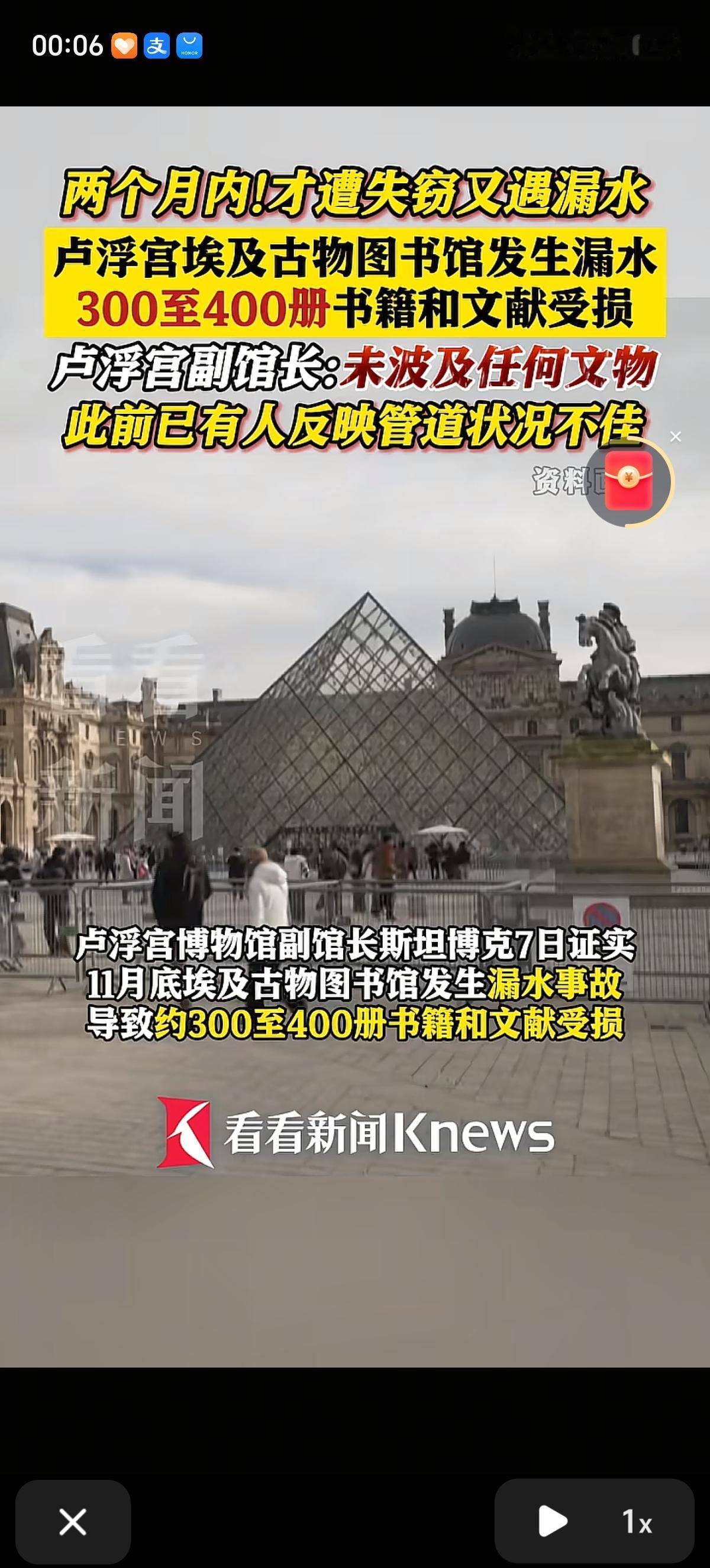 卢浮宫漏水了,漏的脏水,埃及古物图书馆从天花板往下渗水,把300到400册书籍和文献给泡了,距离卢浮宫被盗没过2个月呢。 上回丢珠宝,这回书籍文献受损,卢浮宫日常掉链子也是无奈,钱都拿去买新艺术品去了,图书馆水管出问题没钱修,直接水管漏水了。 卢浮宫是知道挽尊的,说这些书烘干一下还能用,也不是只此一份。看来卢浮宫早有准备,书籍有备份。 想想上个月卢浮宫还关了古希腊陶瓷展厅 ,现在监控一多半还没装完,安保升级要等到2032年完成,真是让人啼笑皆非,也不知道是真没钱还是太抠门了。
