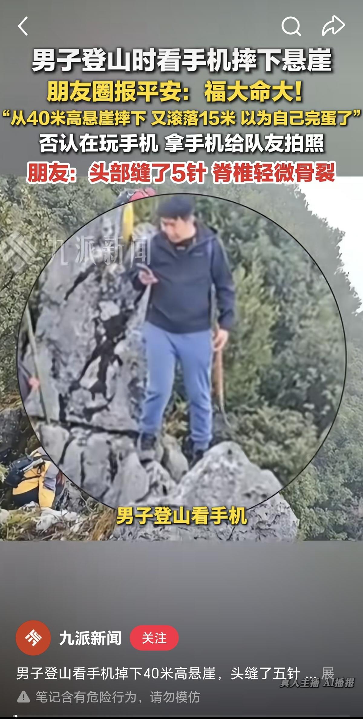咱就是说,这个手机是非看不可吗? 爬山因为手机拍照出过不少事故了 这个男人也是命大 从40米高的悬崖摔下去 竟然只受了一点轻伤 比起九月份那个在四川四川甘孜贡嘎山那玛峰,解开冰爪给队友拍照的而不幸坠亡的那个31岁的小伙,毫无疑问他是幸运的。 还有8月份再辽宁丹东,有一个51岁的中年男子坐在景区的栏杆上拍照,结果摔了下去,没救回来。 这样类似的事故一再发生是因为我们的旅游安全意识太淡薄了。而且很多人为了追求所谓的网红打卡点,盲目跟风,把自己置身在危险之中。
