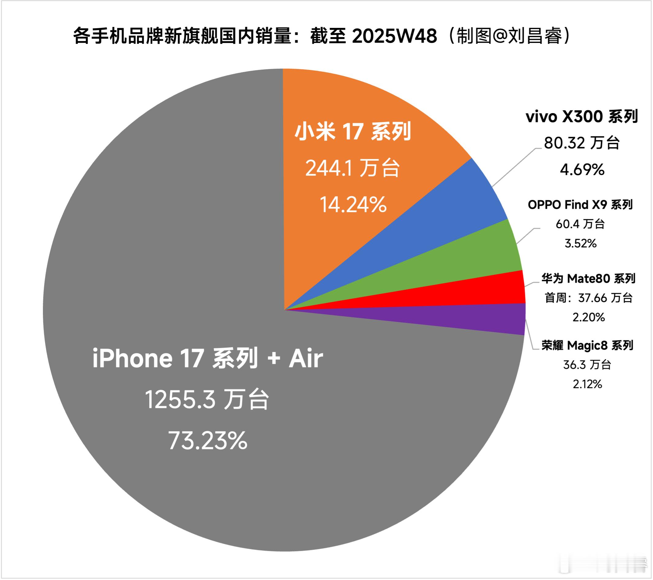 更新 W48 各厂商旗舰机国内销量📱数据 系列 + Air:1255 万台占比超 73% 系列:244.1 万台占比 14.2%W48 系列也开售了,但只有几天离谱的是才卖了几天,就超过 Magic8 系列了…其他四家系列销量总和 215 万台,占比约 12.5%目前来看新机还属于「一超一强」的局面等等 Mate80 后续的表现,现在看似乎是不如前代