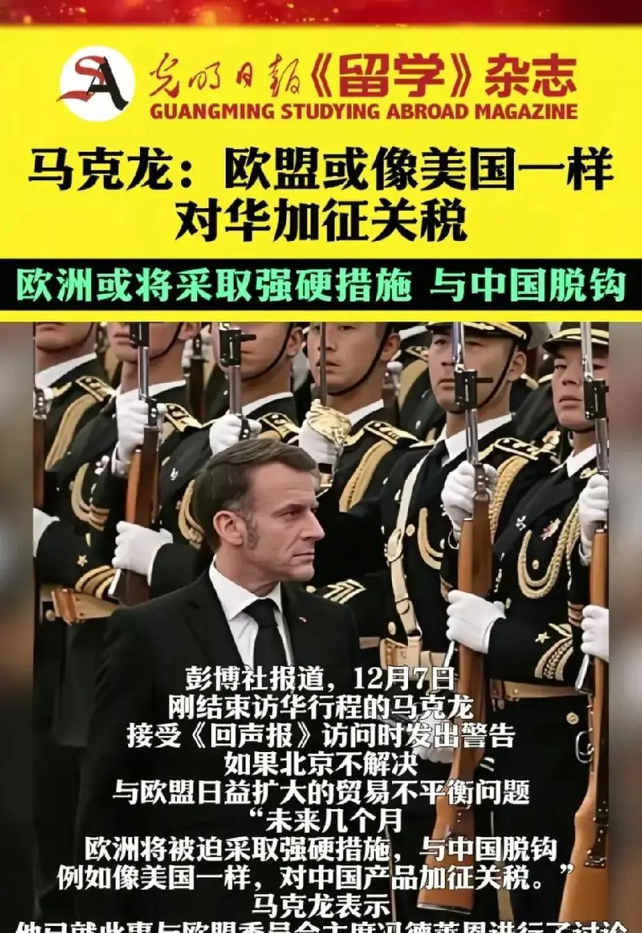 马克龙前脚在成都和大学生热情自拍,后脚回国就翻脸要加关税?这变脸速度比川剧还快! 12月7日刚落地巴黎,他就拿“贸易逆差”说事,威胁对中国加征关税。可明明访华期间签了航空、能源一堆大单,空客还拿了160架飞机订单,转头就“吃饭砸锅”? 贸易本就是双向选择,法国红酒、奢侈品在中国市场赚得盆满钵满,自家企业竞争力下滑,不想着提升效率,反倒甩锅给“逆差”。这波操作,连法国网友都吐槽:“总统先生,先看看我们的罢工和35小时工作制吧!” 说到底,市场经济靠的是真本事。您觉得,这种“既要又要”的套路,能逼中国低头吗?