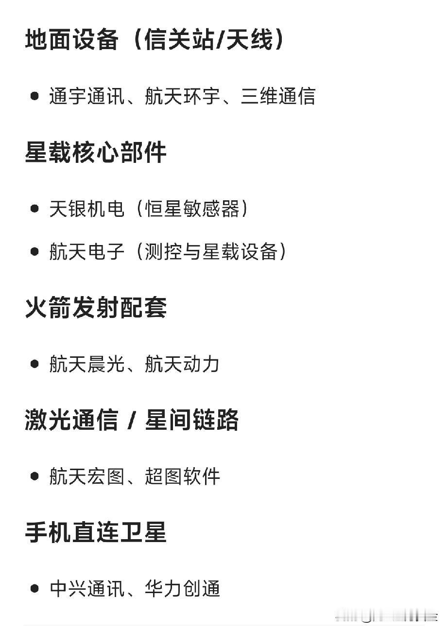 卫星互联网概念细分龙头企业汇总: 卫星制造 中国卫星、上海沪工 卫星运营 中国卫通、中国联通 卫星应用与服务 航天宏图、中科星图 卫星通信芯片 铖昌科技、华力创通、臻镭科技 卫星通信终端 华力创通、海格通信、雷科防务 地面设备(信关站/天线) 通宇通讯、航天环宇、三维通信 星载核心部件 天银机电(恒星敏感器) 航天电子(测控与星载设备) 火箭发射配套 航天晨光、航天动力 激光通信 / 星间链路 航天宏图、超图软件 手机直连卫星 中兴通讯、华力创通