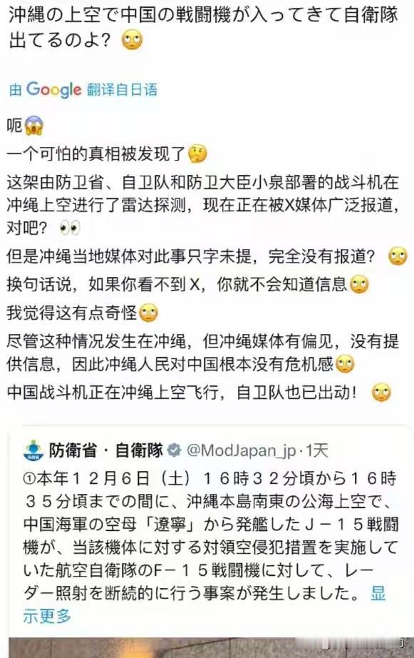 这事儿闹的,日本全国沸腾,老美一声不吭,还在发纪念珍珠港,这可把日本气的够呛。 日本贼喊捉贼,四处喊冤,说被我们歼15的雷达照了,但就是不说为啥照它。它也不想想,平白无故我们会照它吗?远一点说,平白无故美国会送它一个“小男孩”和“胖子”吗? 多数日本人事后才知道中国航母和战斗机在家门口进行环日军事训练这个事,搞得日本人现在各种怨气。日本就是这样,只能想象着自己欺负别人,别人不能招惹自己,受了一点儿屈就会嗷嗷不止。 知道原来在冲绳(琉球)附近被照的,心里更气了。还说琉球人无感,那里的媒体有偏见(意思就是心向中国)。这句话倒是说对了,你霸占了别人的地盘,别人还会跟你一心吗? 我们在公海演习,你们跑到跟前捣乱,自己做了错事,被修理了别吭就行了,还四处喊冤,以后再来捣乱,就不是照一下那么简单了!