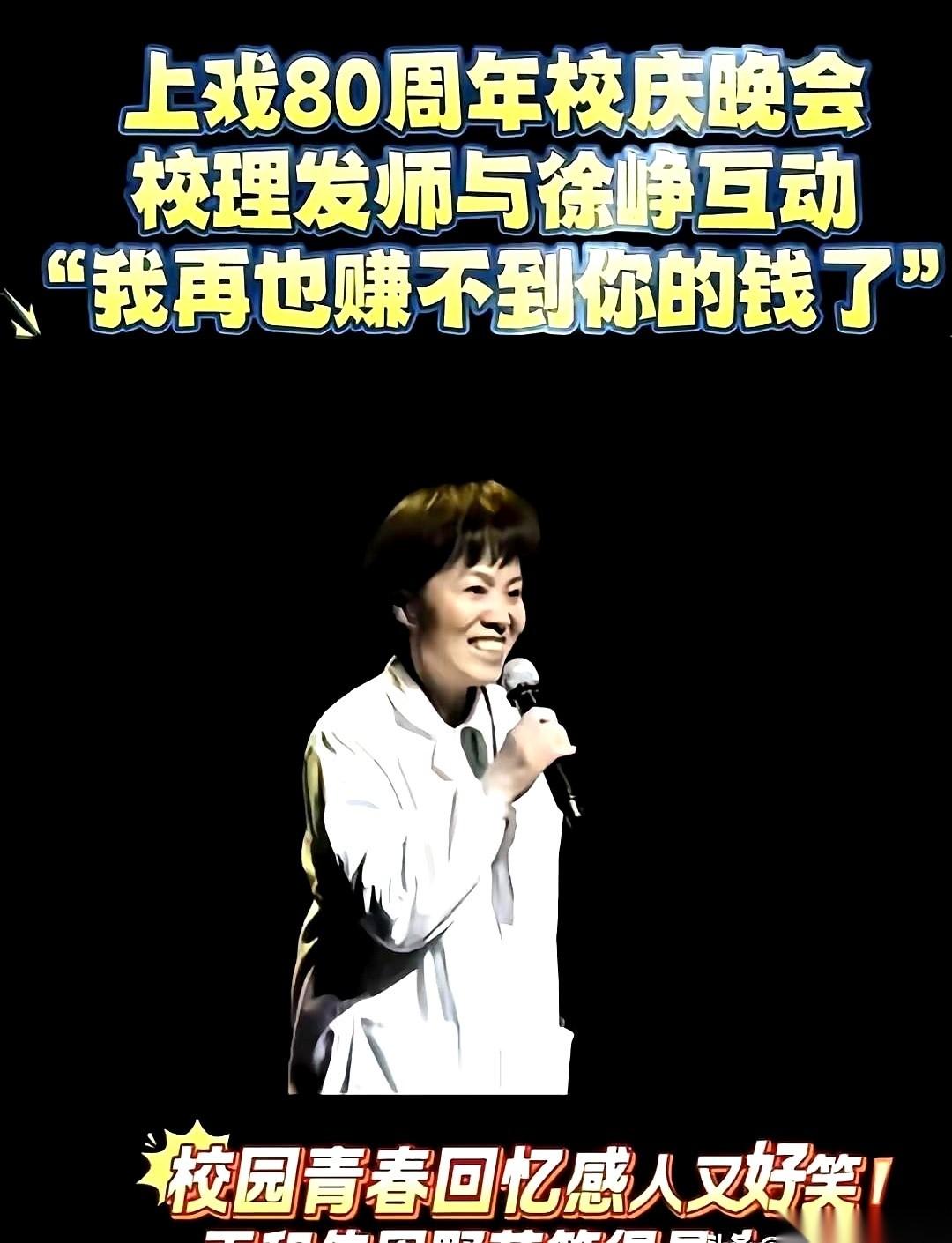 我跟你讲,一个学校牛不牛,看校庆就知道了。 上戏80周年,最炸的一幕,不是台下坐了多少明星大腕儿, 是他们把学校理发店的阿姨,请上了台。 阿姨拿着话筒,看着台下一个个熟悉又陌生的面孔,也不怯场,慢悠悠地说: “徐峥啊,阿姨再也赚不到你理发的钱咯。” 全场先是一愣,然后“哄”地一下全笑了,所有镜头刷地一下全对准了徐峥。 你看人家的反应。 徐峥站起来,特坦然地摘下帽子,露着一个锃亮的光头,还特意朝阿姨那边亮了亮。 那一下,全场直接笑疯了。 就这个瞬间,真的,比任何精心编排的节目都动人。 什么是真正的体面和底蕴? 不是你今天多红,咖位多大。 而是你功成名就之后,还愿意大大方方地,陪着当年给你剪头发的阿姨,开一个关于“秃头”的玩笑。 学校记得她,是情分。 他接住这个梗,是教养。 那一刻,台上站着的不是理发师,台下站着的也不是大导演。 就是一个阿姨,在怀念一个当年头发还很茂密的小伙子。 真好。