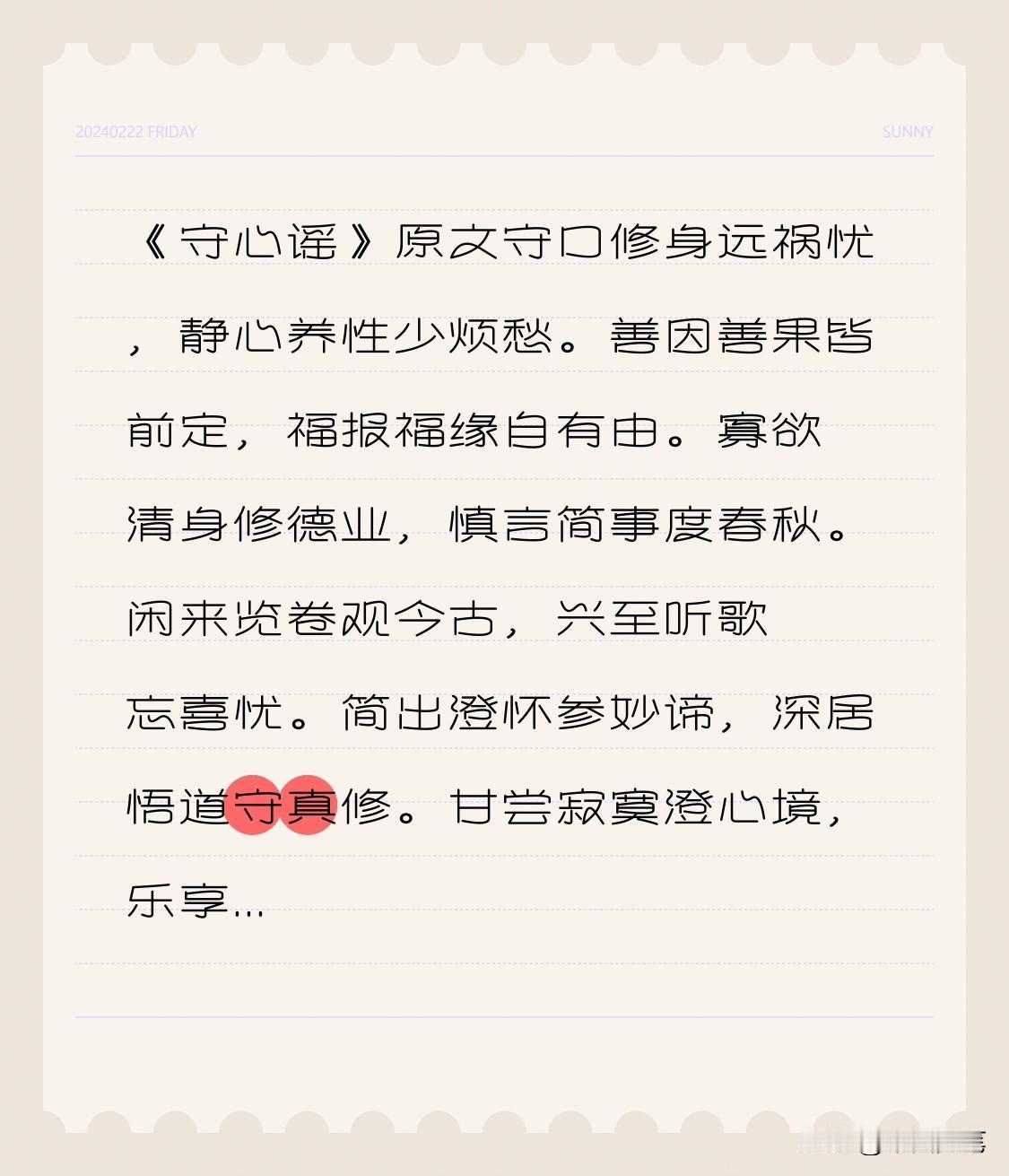 《守心谣》原文 守口修身远祸忧,静心养性少烦愁。 善因善果皆前定,福报福缘自有由。 寡欲清身修德业,慎言简事度春秋。 闲来览卷观今古,兴至听歌忘喜忧。 简出澄怀参妙谛,深居悟道守真修。 甘尝寂寞澄心境,乐享清欢淡泊求。 家睦人和天地阔,神怡心畅岁华酬。 此身但向云中寄,笑看红尘万事休。 闭口方知真滋味,静心始觉天地和。 善念深种福田地,良行自渡银汉河。 遇事当缓三缄口,观人何必费揣摩。 尘缘缥缈轻似絮,执念锋锐重如戈。 晨起庭除勤洒扫,暮归藤萝自婆娑。 闲来清茶胜醇酒,兴至翰墨汇长河。 淡看风云九霄变,笑谈日月两轮梭。 窗前瘦竹摇疏影,案上檀烟袅婀娜。 不羡朱门黄金屋,独爱青溪碧水波。 此生守得素志在,天地悠悠自婆娑。淡泊养心 宽心是福