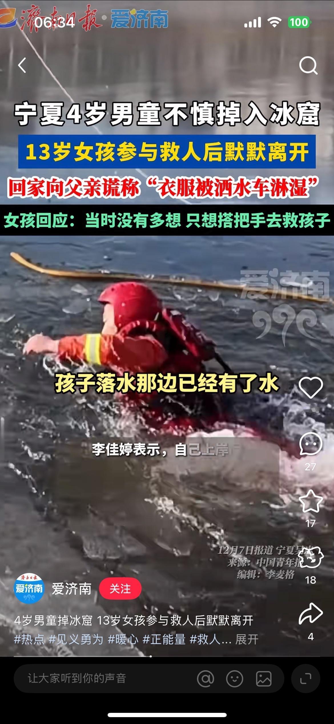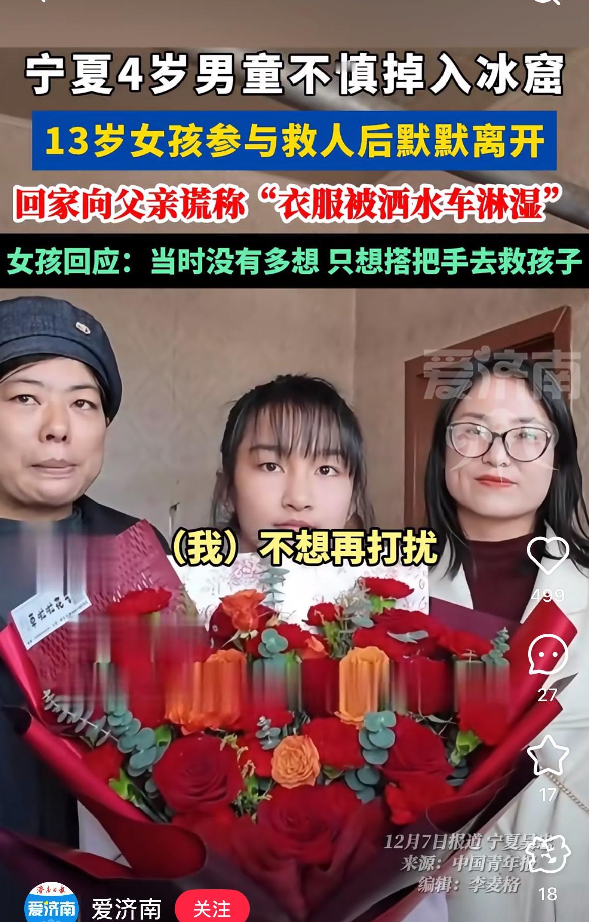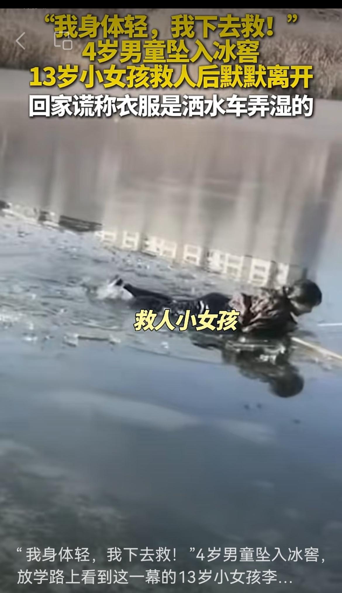 13岁女孩冰窟救人, 人民日报点名表扬才是最牛“勋章”! 这波必须为宁夏13岁的李佳婷疯狂打call! 比收礼物、受校表彰更珍贵的,是官媒盖章的善良与勇敢。 冰面破裂时,她喊着“我身子轻”就敢爬向冰窟,自己落水冻得发抖还攥着救援管子不放。 救完人悄悄溜走,回家谎称衣服被洒水车淋湿,这份低调太戳人。 人民日报点赞她“藏不住的善良”,这可不是普通荣誉,是给整个社会树了榜样——真正的美德从不是刻意表现,而是刻在骨子里的本能。 这样有勇有谋又谦逊的姑娘,未来注定闪闪发光。 你觉得该给这个小英雄额外的奖励吗?来评论区说说~学生救人事迹 女孩勇敢救人 爬冰救人女孩获校级见义勇为荣誉 孩子的成绩和品德比较哪个更重要呢