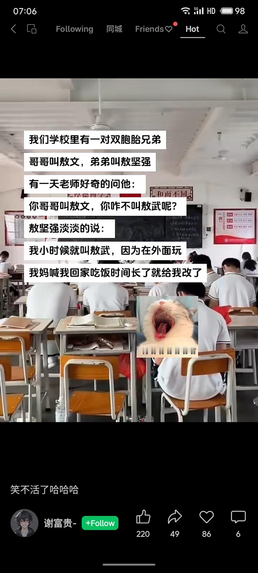 学校一对双胞胎,兄名敖文,弟原叫敖武。因母亲在外唤其回家吃饭耗时过长,遂为弟改名敖坚强。老师问起时,弟弟淡定解释缘由,令人忍俊不禁。