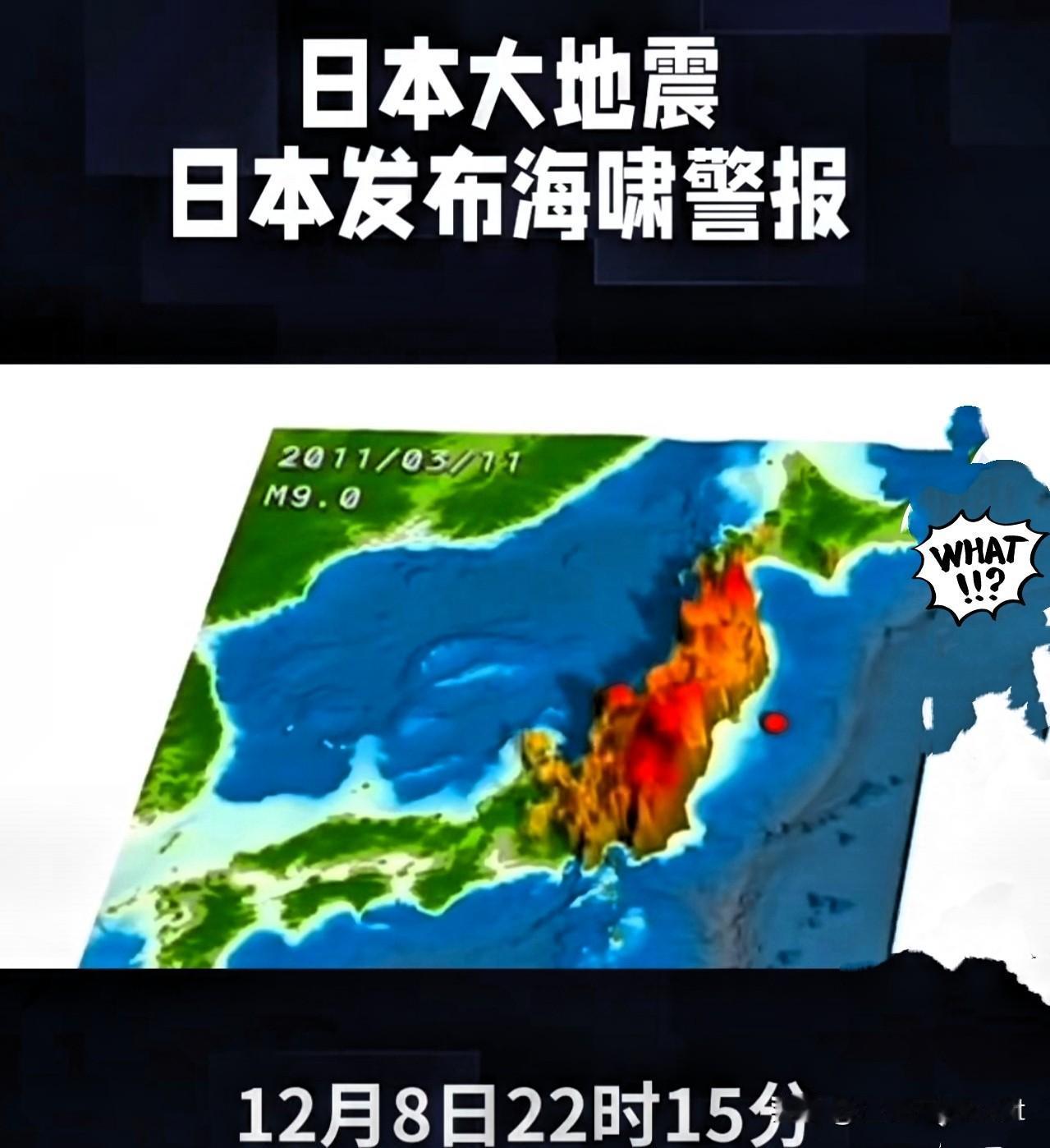 这下好了! 谁也没想到, 就连高市草苗也没到,人人都没想到事发… 北京时间2025年12月8日22点15分(当地时间23点15分),日本本州东部近海突然发生强震!中国地震台网测的是7.5级,日本气象厅后来修正为7.6级,震源深度50千米,震中就在青森县东部海域附近。 大半夜的强震直接把东京、青森、岩手、北海道等地的人从睡梦中晃醒!青森县居民说“摇晃了快一分钟,根本站不住”,家里餐具、便利店商品全撒了,有的酒店窗户都震碎了,远在神奈川的华人都能感觉到台灯晃个不停。 震后不到10分钟,日本就发了海啸警报,说部分海域可能有3米高浪,当晚23点50分海啸就陆续到了沿岸,最高测到70厘米浪高。沿海居民赶紧开车往高地躲,路都堵满了,目前只有多人轻伤,青森县3900多户、岩手县300户停了电,部分道路裂了缝还喷地下水。 值得关注的是,福岛第一核电站的核污染水排海已经暂停了,目前核电站没发现异常,但气象厅提醒未来一周可能还有更大地震! 这事也给咱们提了醒,家庭应急包一定要放显眼好拿的地方,按3天用量准备:保质期长的压缩饼干、罐头,每人每天1.5升水,手电筒、打火机、急救用品、少量现金和证件复印件都不能少。这些东西宁肯用不上,也不能等出事了没准备!转发提醒身边人,愿大家都平平安安!日本大地震 日本强震警报 日本大地震预言 日本地震带 各位读者怎么看?评论区讨论