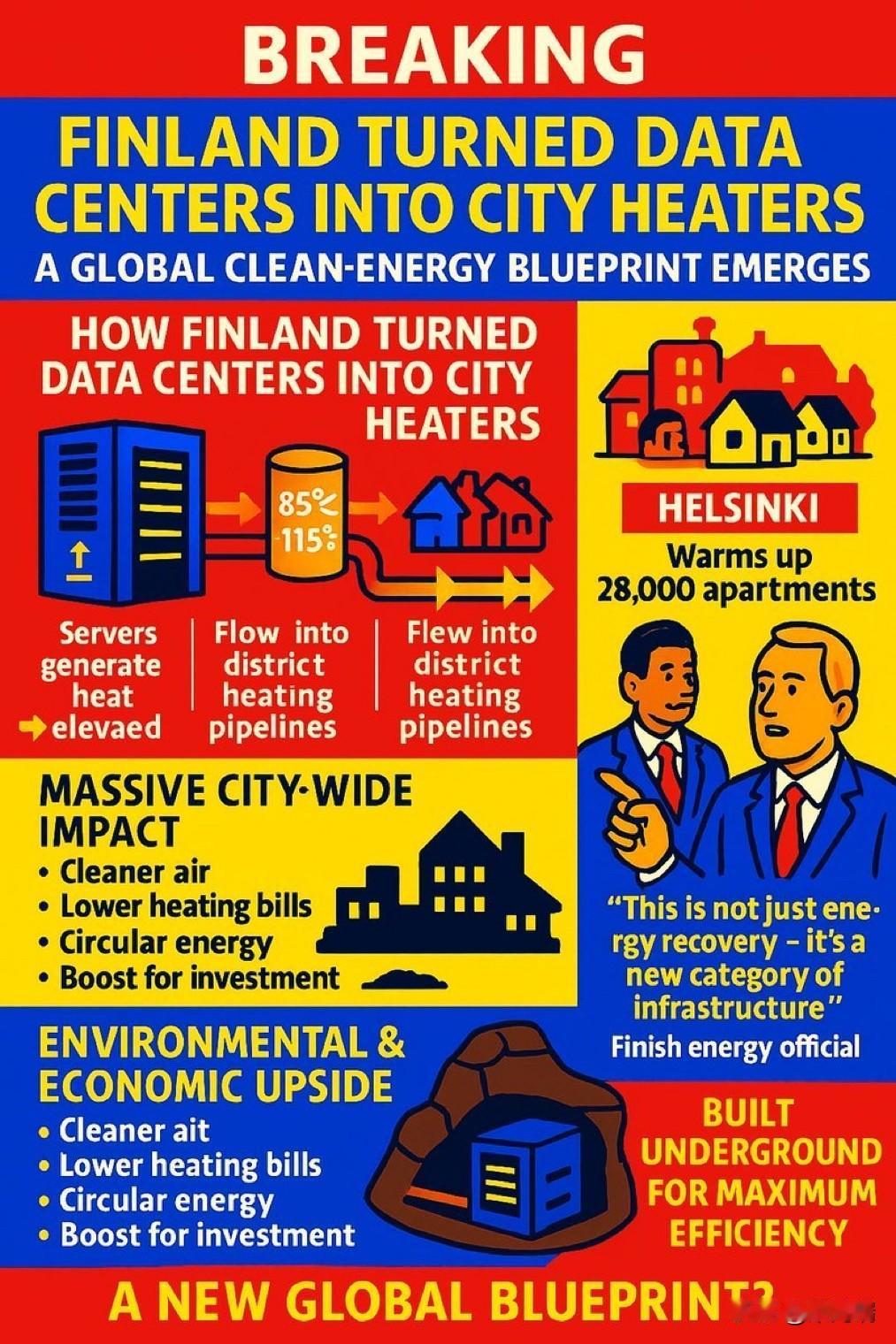 突发新闻:芬兰将数据中心余热改造为城市供热中心——全球清洁能源蓝图初现端倪 赫尔辛基/埃斯波/柯克努米 — 2025 年 12 月: 芬兰正在改写城市能源的未来,新一代超高效数据中心开始将废热输送到大型区域供热网络,为整个城市供暖——这一世界首创的模式目前正引起国际关注。 官员们表示,该系统已经减少了对化石燃料的需求,大幅降低了排放,并为成千上万户家庭供暖,将曾经浪费的能源变成了国家资产。 芬兰如何将数据中心变成城市暖气 几十年来,数据中心向空气中排放了大量的余热。芬兰现在正在收集这些“数字废气”,并将其直接输送到人们的家中。 工作原理: 服务器会产生热量→冷却系统会将其捕获。 •水吸收热量→高效热泵将其提升至85°C–115°C 热水流入芬兰的区域供热管道,为整个社区供热。 能源专家称其为“十年来最优雅的气候解决方案之一”。 对整个城市的巨大影响 芬兰的项目不是试点实验——它们是城市规模的能源引擎。 赫尔辛基 一个数据中心供热项目可以为多达 28,000 套公寓供暖。 Espoo 和 Kirkkonummi(微软项目) 预计回收的热量将满足近 40% 的总供暖需求——这是一项前所未有的成就。 哈米娜(谷歌设施) 可提供整个社区全年高达 80% 的热量。 官员表示,综合减排量将达到每年数十万吨。 环境与经济优势 •空气更清新:大幅削减化石燃料使用量 •降低取暖费用:居民可享受更便宜、更稳定的供暖。 •循环能源:数字经济如今为清洁能源系统提供养分 •投资增长动力:芬兰正成为全球绿色科技数据中心的磁石 一位芬兰能源官员表示:“这不仅仅是能源回收,而是一种新型的基础设施。” 建于地下以实现最高效率 芬兰的许多高科技数据中心都位于: •以前的防空洞 •深邃的花岗岩洞穴 •天然寒冷的地下隧道 这些地点可以大幅降低制冷能源需求,并极大地提高热回收性能。 新的全球蓝图? 能源分析师表示,欧洲、加拿大和东亚的寒冷气候城市可以效仿芬兰的模式——将数据中心从能源负担转变为清洁能源引擎。 研究人员指出:“这就是数字世界如何为可持续的未来提供动力。