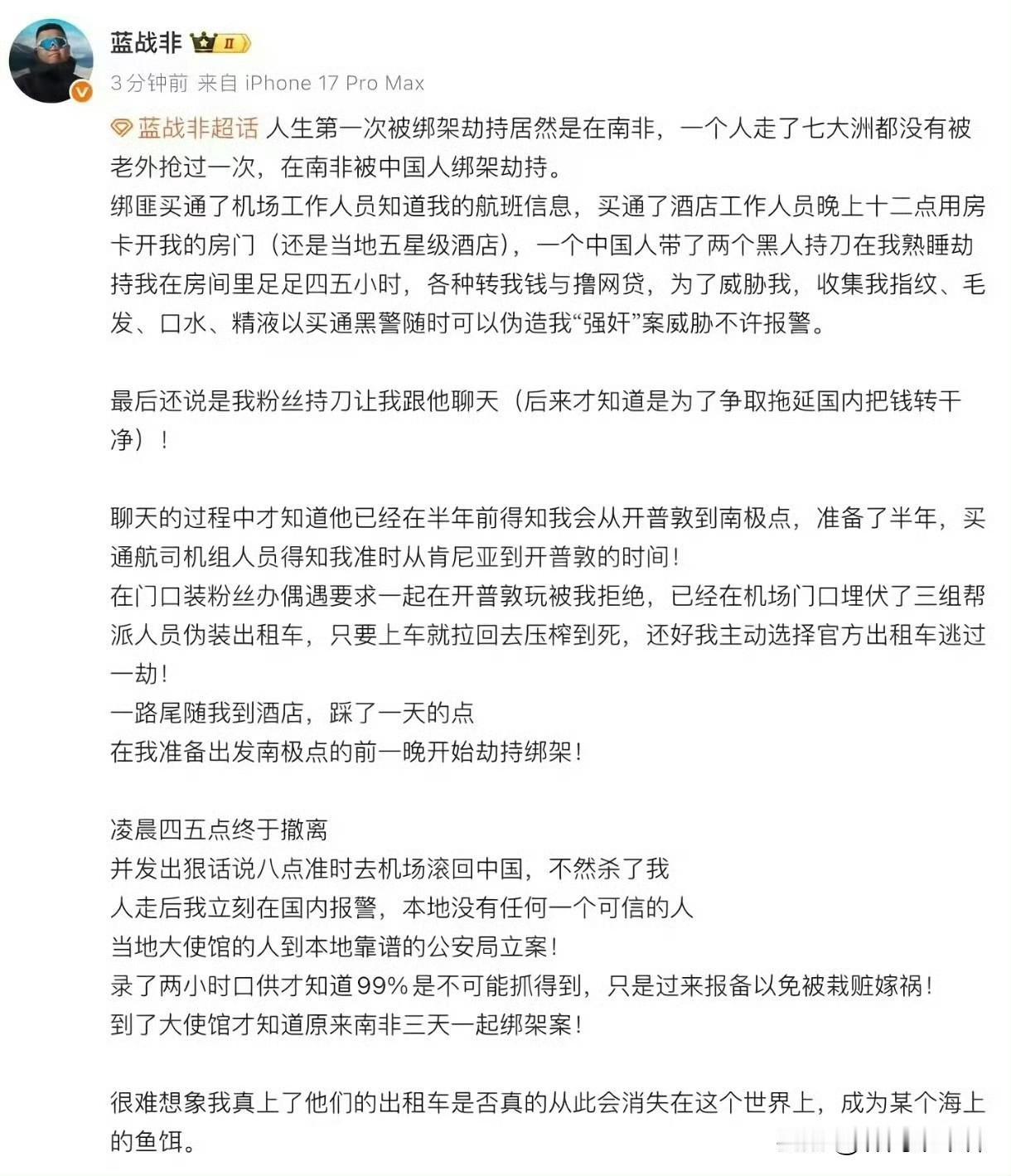 大网红蓝战非在非洲遭中国人绑架,告诉我们这年头女人防火防盗防闺蜜,男人得防火防盗防同胞! 南非本就乱,三天发生一起绑架案。出门在外一不能露富,二不要暴露行踪。你猜这些绑架他的中国人为啥在不在中国混,跑到南非闯江湖去了?