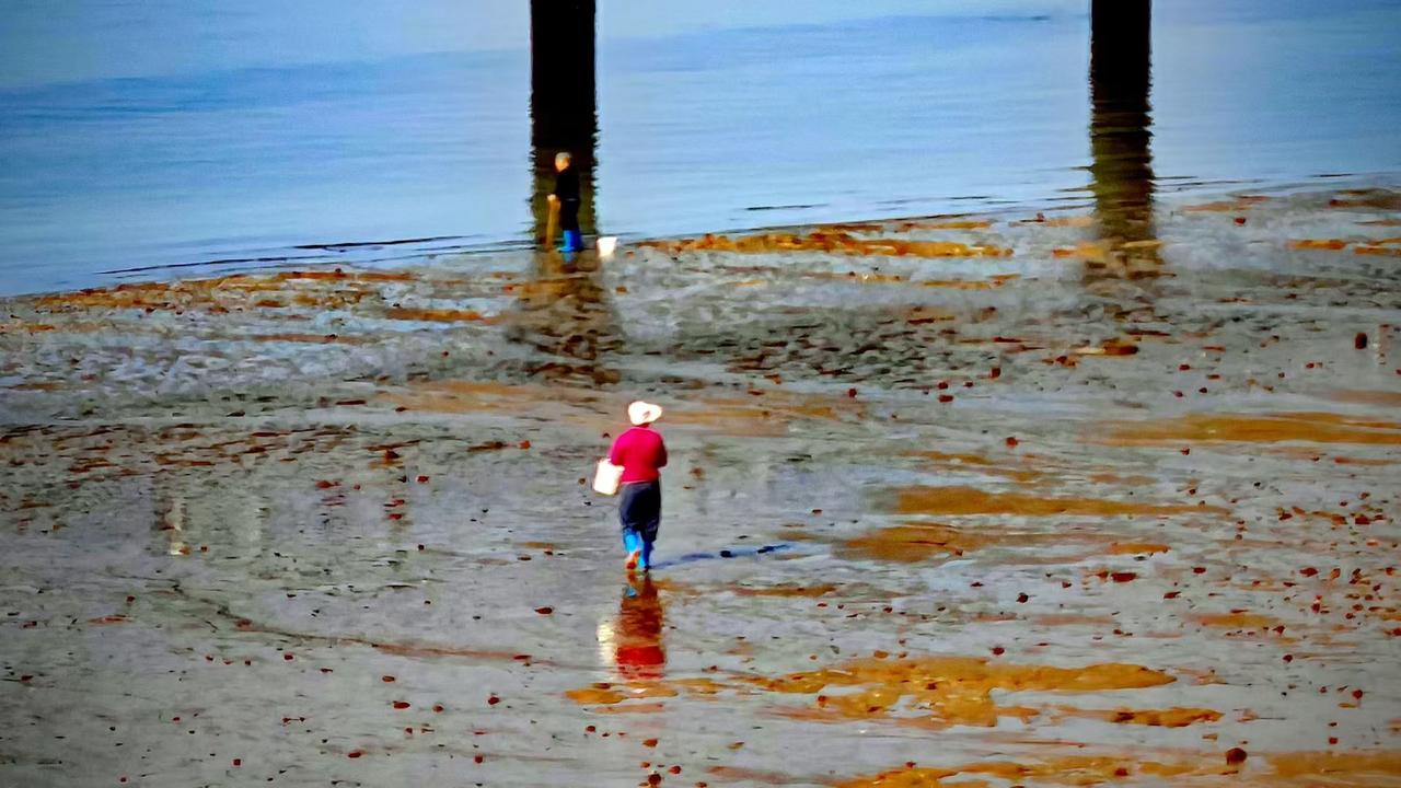 滩涂浸在浅光里,木柱的影斜斜铺着。红衫沾了潮意,白桶晃着细碎的海味,连脚步都裹着湿软的风——这是海把日子兑成的淡甜,藏在每一步踩实的沙里。