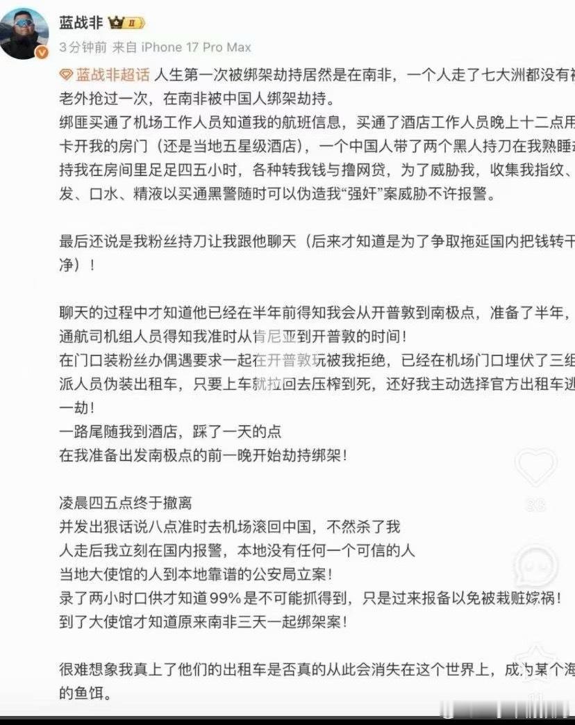 蓝战非被绑架太炸裂了…夏天去普吉岛玩,他们做的攻略第一条就是在国外遇到特别热情的中国老乡一定要小心…那是真敢弄你…蓝战非人设包装的太深入人心了了,我都看过不下10条说他长相和财富割裂的反差,太高调了