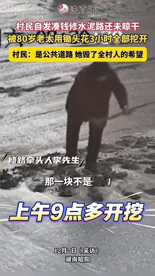邵阳,村民自发凑钱修水泥路,结果水泥还没干,就被 80 岁老太太用锄头花 3 小时全部挖开。老太太:你们修路占了我家的地!负责人:“这不是她家的地,公家的路还给她留了两米,可她就是要把修好的路给挖了,报案都没用,全村的希望都被她毁了!” 老太仗着年纪大,钻了“没人敢碰”的空子,可破坏公共设施本就涉嫌违法,年龄从来不是免责的理由。 所谓“尊老”,尊的是明事理的德,不是蛮不讲理的赖。这种只顾个人执念、践踏全村利益的行为,伤的是大家共建家乡的心。要是都这么搞,谁还愿意为公共事出力? 维护公共利益不能只靠劝说,该有的约束和赔偿不能少。你觉得该怎么处理才既合理又能服众?来评论区聊聊~