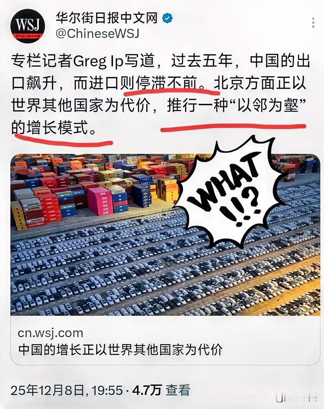华尔街日报又故技重施!? 《华尔街日报》12月8日发文炒作中国“出口大增、进口停滞”,妄称中国推行“以邻为壑”增长模式,论调刻意歪曲事实,甚至暗合鸦片战争前西方对华施压逻辑,其本质是霸权思维下的舆论抹黑。 客观数据不会说谎,近五年中国出口年均增长6.3%,进口年均增长2.1%,进口增速放缓则是全球需求疲软、大宗商品价格波动等共性因素导致,绝非刻意抑制进口。期间中国进口总额累计超12万亿美元,持续为全球各国提供广阔市场,仅与东盟贸易额2024年就突破1.2万亿美元,连续5年互为最大贸易伙伴,累计对东盟投资超4000亿美元,RCEP落地后区域合作红利持续释放,惠及数千万民众,是公认的区域合作典范。 正如网友所说:美媒借外贸数据刻意抹黑,忽视全球经济客观环境,无视合作共赢实效,是其霸权思维作祟,妄图遏制中国发展。 美媒无视中国对全球经济的贡献,翻炒抹黑论调,实则暴露其对中国发展的焦虑。中国外贸始终坚持互利共赢,所谓“以邻为壑”纯属莫须有指责,根本站不住脚。 美媒无视事实抹黑中国外贸,拿片面数据炒作“以邻为壑”,背后藏着怎样的深层目的?你如何看待中国外贸对全球经济的贡献?