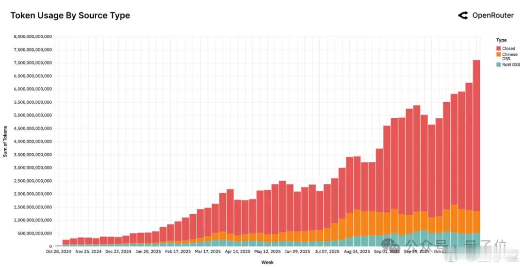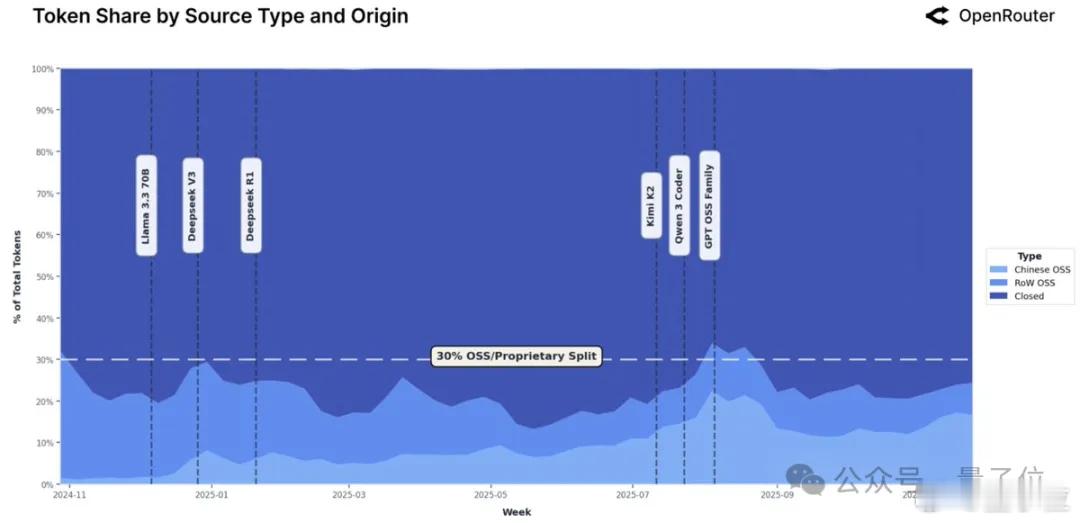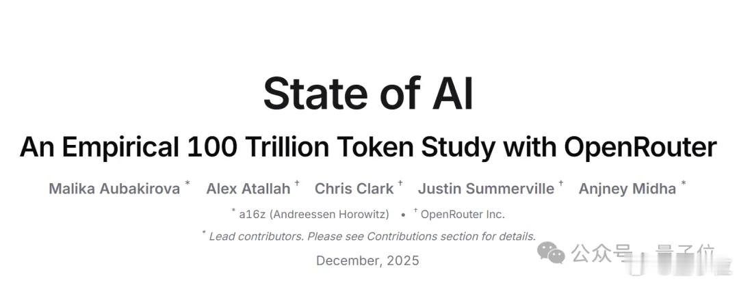 100万亿Token揭示今年AI趋势硅谷报告用百万亿Token揭示今年AI趋势 用百万亿Token揭示今年AI发展趋势,硅谷的这份报告火了!无论是分析问题的角度,还是里面得出的一些结论,都被𝕏网友热烈讨论。而且里面还公开肯定了中国开源模型,其每周Token用量占比一度高达30%。并且除了DeepSeek,编程领域的新秀MiniMax也被特意cue到。这份报告由OpenRouter和a16z联合出品,标题为《State of AI:An Empirical 100 Trillion Token Study with OpenRouter》。里面分析了自2024年11月至2025年11月,OpenRouter平台上300+模型的使用情况,涵盖GPT系列、Claude、Gemini、DeepSeek、Qwen、Kimi等国内外主流开源与闭源模型。而且统计的角度相当特别——不看各种基准得分,而是看模型的真实Token消耗量。Token消耗量直接反映了模型被使用的方式和程度,因此比测试分数更能揭示其本质价值。报告详情:网页链接