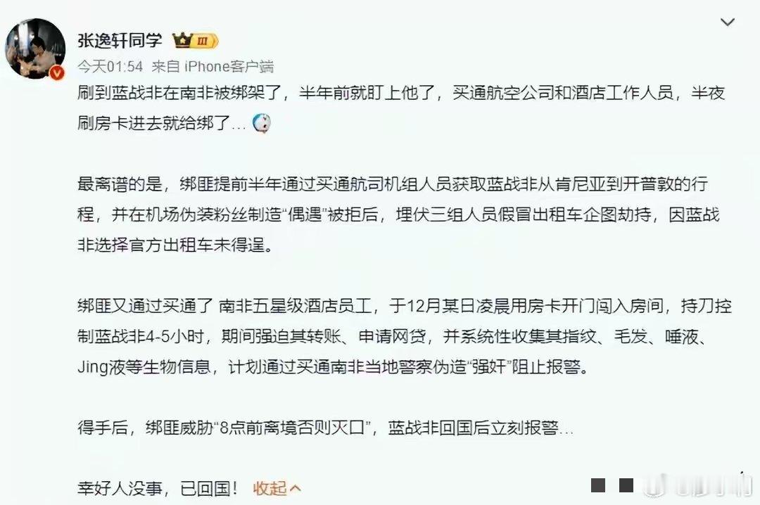 蓝战非称被绑架能留条命已经是烧高香了,钱财乃身外之物,花钱买教训, 好在人无大碍,回国吧 ,钱也够花一辈子了,平安健康才是最重要的!热点观点
