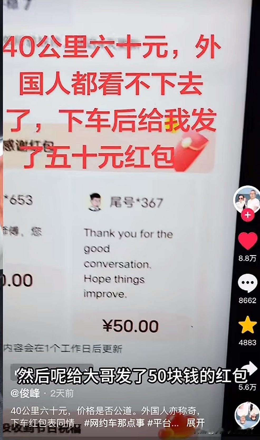 一网约车拉三个外国人,得知车费后外国人震惊出于同情下车后又给司机发了50元红包并
