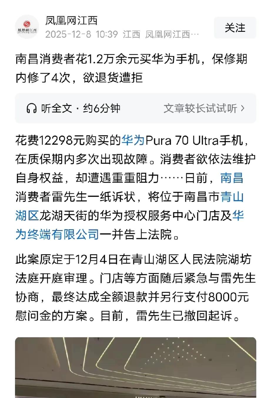 江西南昌,男子花12298元买华为Pura70 Ultra手机,质保期2年,谁料,才用一年,手机屏幕就开始出现卡顿、死机、暗屏等一系列问题,男子拿去服务中心维修了4次,问题依然得不到解决,男子不干了,要求退货退款,遭到拒绝后,他一气之下将服务中心和终端有限公司告上法庭,要求退还12298元和精神损失费1元。结局让男子喜出望外。 2024年4月19号那天,雷先生出门逛街,路过南昌某家华为服务中心的时候,忍不住进去逛了逛。 店员告诉雷先生,他们有一款新出的产品,叫华为Pura70 Ultra手机,它不管是定位、配置都很不错,雷先生听完,接过店员递过来的样板机,仔细研究了一番。 的确那个刚上市的款式,各方面都让雷先生很满意,手机价格是12298元,质保期为2年,雷先生没多想当场就拿下了。 因为是刚上市的新机,雷先生拿回去后,使用时格外小心,平时也很爱惜他的手机。 谁料,新机才使用一年,问题开始频频出现,2025年4月20开始,雷先生的手机屏幕开始出现卡顿,有时还暗屏甚至死机。 雷先生觉得很纳闷,不是说了质保期2年吗,怎么才用一年就开始出现各种各样的问题,他不禁怀疑,这个机子各方面性能真的对得起这个价格吗? 不过,既然出了问题就得解决,当天雷先生就拿着手机到该服务中心维修。 后来经过维修主管检测后,他告诉雷先生,手机主板出现故障,要等待材料才可以更换。 他们给雷先生出具的服务报告上写着维修方式为:参数调整加保养。 4月21号,雷先生接到服务中心电话,通知他手机已经维修好,可以去取机了。 雷先生满怀期待去拿回手机,可他拿到家后仔细观察才发现,问题并没有完全解决,而且还出现了新的问题,手机后壳密封不严。 用了几天后,雷先生决定还是拿手机到服务中心把它彻底修好。 4月25号,雷先生把手机拿到服务中心,告知他们,手机后盖密封不严。 店员回复雷先生,后盖密封的问题需要返厂处理,雷先生同意了他们返厂处理,他提醒店员希望这一次能彻底修复好。 4月27号,雷先生接到服务中心电话说,死机的现象已经解决了,不过后盖密封问题手机得拿回原厂处理。 雷先生只能继续等,终于,在5月3号这天,雷先生接到服务中心的电话称,手机已经彻底修好了。 没想到,雷先生过去拿手机后仔细检查,竟发现,手机又开始出现卡顿、暗屏甚至死机的现象,合着绕了一圈等于没修。 维修主管知道后当即拿着雷先生的手机到后台继续维修,可一直到11月20多号,手机都没修复好。 雷先生失去了耐心,也不再对服务中心抱有希望,他提出退货退款,他的理由是毕竟手机还在质保期内,但遭到了拒绝。 店长告诉他,只有“同一故障一年内修两次”才能换机。可他这4次送修,只算“检测”,并不算“维修”。这让雷先生特别生气。 雷先生一直要求真的维修,第一次送修时,门店虽然申请了换主板,结果没换,说要先调试软件,再看要不要换。 最后主板也没换成,他提换机,对方又拿“都是调试检测、不符合维修两次的规定”推脱。手机问题一直没解决,对方说法还变来变去,明显是想推卸责任。 雷先生觉得,自己的情况完全符合“三包”政策,理应有相应的权益保障,可不管他怎么提诉求,相关方都不理睬。 雷先生气不过,把服务中心和终端有限公司告上法院,要求对方赔偿12298元的直接损失,再加上1元精神损失费,总共12299元。 法院原定计划,12月4号开庭,没想到,开庭前,对方主动联系雷先生,提出给他换成即将上市的新款手机,但,雷先生拒绝了,他要求退货退款。 对方同意了雷先生的要求,退还他12298元,并支付8000元慰问金,雷先生最终撤案。 我想说,雷先生的遭遇确实让人窝火:花一万多买的旗舰机刚用一年就故障频发,四次送修不仅没解决问题,还被门店用“检测不算维修”的说法搪塞,换谁都会觉得权益受了侵害。 支持国货的心意被辜负,维权过程的憋屈可想而知。 不过,华为后续的处理态度值得肯定,开庭前主动协商、满足退货退款要求还额外补偿,没有硬扛到底,既体现了大企业的担当,也给了消费者满意的交代。 知错能改、重视用户诉求,才是国货品牌长久发展的关键,希望华为能以此为戒,把售后和品控做得更扎实。 根据《部分商品修理更换退货责任规定》第11条,在三包有效期内,修理两次,仍不能正常使用的产品,凭修理者提供的修理记录和证明,由销售者负责为消费者免费调换同型号同规格的产品或者按规定退货。 本案中,雷先生的手机在2年质保期内,因主板故障四次送修仍未解决,已满足“修理两次仍不能正常使用”的情形,门店以“仅为检测不算维修”推脱不符合法律规定。 华为最终退货退款并支付慰问金的处理,符合该法条对消费者权益的保护要求。 对此,大家怎么看? 关注@猫眼学法 品读案例故事,学习法律经验。
