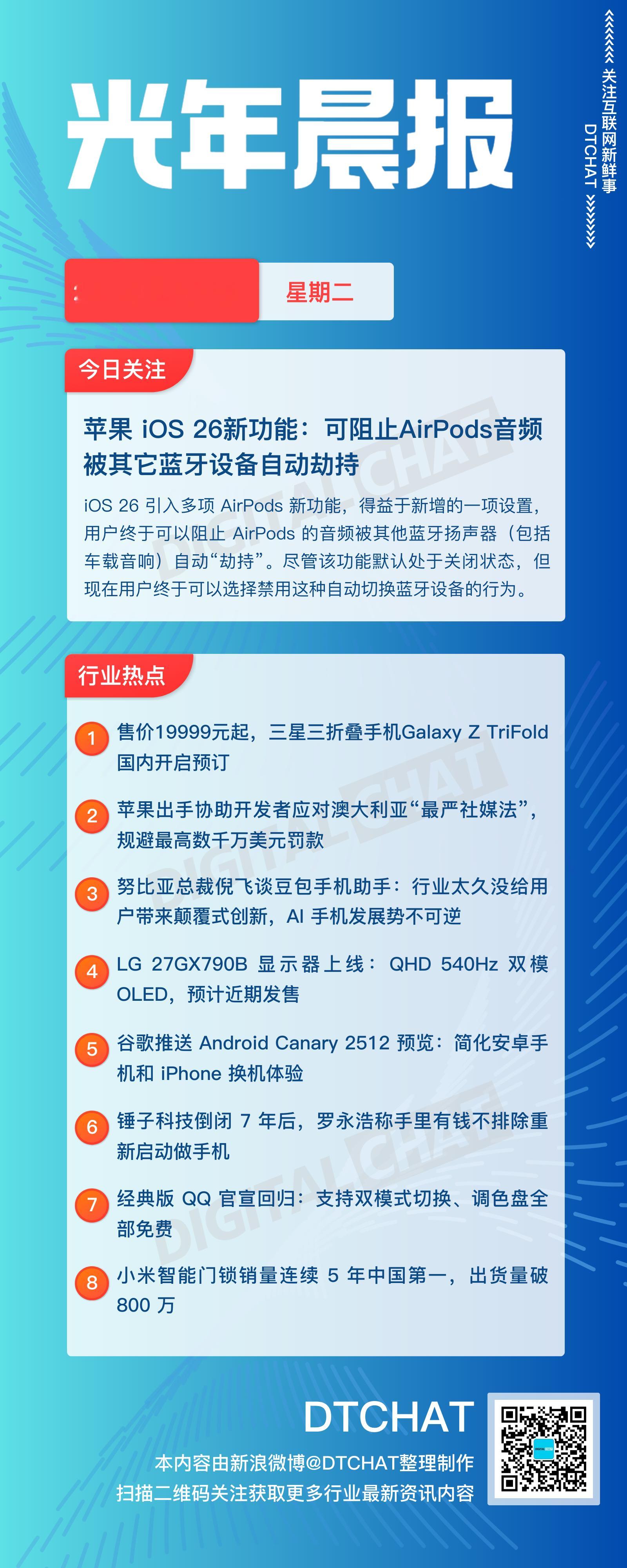 vol.886|12月9日:DTCHAT光年晨报今日关注:苹果 iOS 26新功能:可阻止AirPods音频被其它蓝牙设备自动劫持