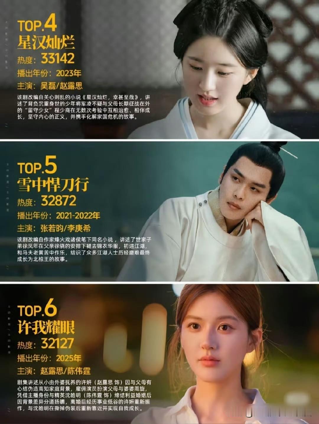 陈晓是不是从来没有单抗的大爆剧? 「笑傲江湖」他是男二。火的是霍建华和陈乔恩。 「神雕侠侣」播放量还不错,但是口碑很差,豆瓣只有5分多。唯一出圈的就是陈妍希的小笼包造型。 「陆贞传奇」标准的大女主剧,提到它第一个想到的,也是赵丽颖饰演的陆贞。 「梦华录」我甚至不知道陈晓演得角色名是什么。只通过刘亦菲铺天盖地的营销宣传,记住了赵盼儿 。 这次的「大生意人」是他单抗的一番正剧,但是全网讨论度最低的却是他。 女二/女三/女主,包括客串的朱亚文,角色热度都比他高很多。 不过,他虽然没有一番爆剧,但是起码没有扑,每一部都保持平播偏上的水准,整体成绩应该还是优于同龄生的。 陈晓