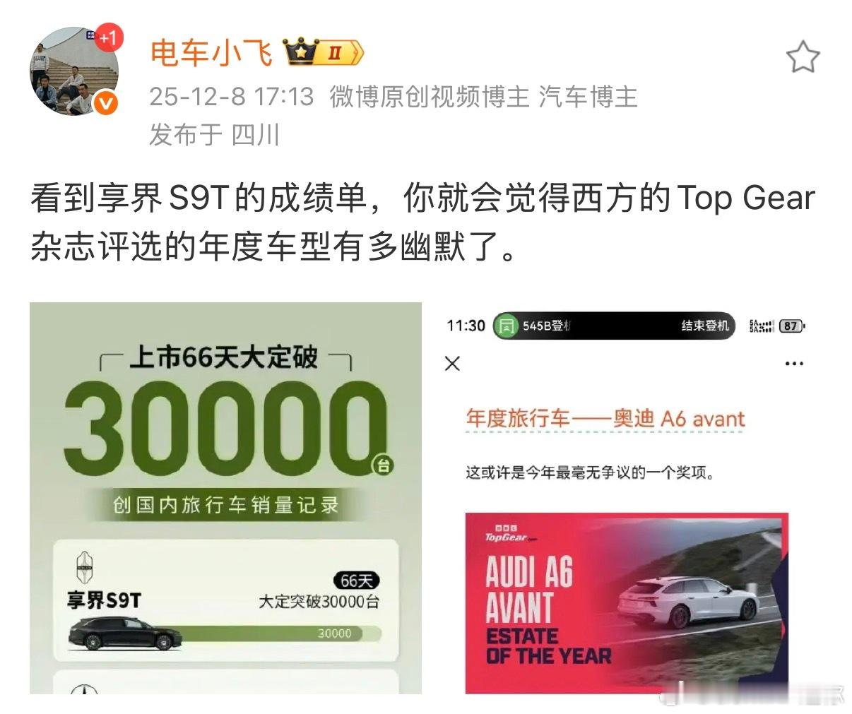 Top Gear评选的年度旅行车是奥迪A6 Avant有多幽默我不懂,但是用大定对比销量确实很幽默了我觉得Top Gear这个评选确实是毫无争议,旅行车之于奥迪就如同遥遥领先之于华为,那都是行业共识,一提到旅行车那必然是奥迪有时候不要盲目自大,你觉得人家幽默,那你倒是先把车卖过去呀……大v聊车旅行车我与汽车的日常