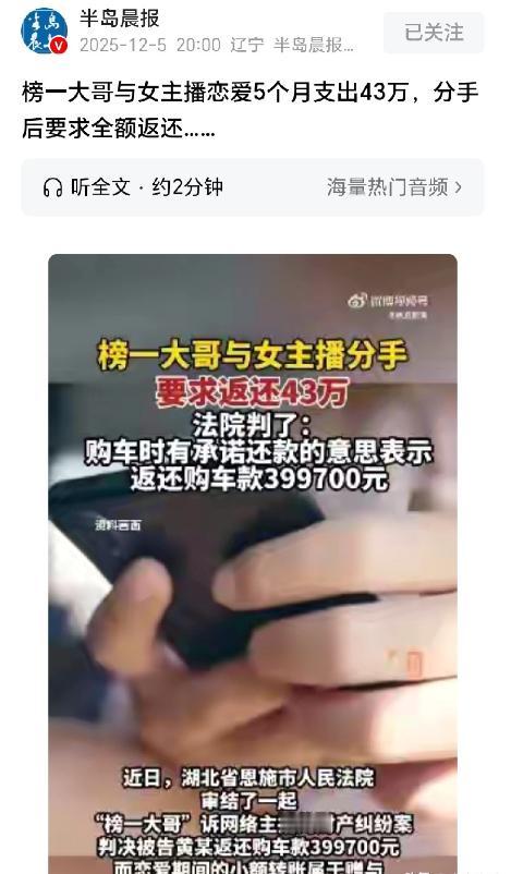 12月5日,湖北恩施,男子看直播认识女主播后,经常给女主播打赏,当了一个月的榜一大哥后,两人顺利发展为恋爱关系,男子更是给女主播不断转账,还给女子买了一辆近40万的车。可谁知,恋爱不到半年,两人就感情破裂,走到分手的地步。感情既然无法勉强,男子提出让女主播返还恋爱期间的所有花销43万,遭到拒绝后,男子告上法庭,法院这样判! 男子三十出头,平时喜欢刷直播解闷。去年夏天,他点进一个本地女主播的直播间,看着屏幕里姑娘说话甜、笑得也敞亮,随手就刷了几百块礼物。主播看见有人捧场,连着念了好几遍他的 ID,还主动发了私信道谢 —— 就这么一来二去,两人熟络起来。 男子是做建材生意的,手里不算缺钱,加上觉得主播性格合得来,没几天就成了直播间的 “榜一大哥”,每天一开播就守着,礼物刷得没停过,一个月下来光打赏就花了小几万。 主播也乐意跟他聊,从直播内容说到日常琐事,没出俩月,直接跟他说 “要不咱处对象吧”,男子一口答应,当天就转了两万块当 “恋爱启动金”。 处对象之后,男子更舍得花钱了:主播说新手机卡,他直接转了八千让换最新款;主播说租房贵,他按月打五千 “房租补贴”;连主播闺蜜生日,他都跟着发了一千块红包。 最豪气的是去年国庆,主播说出门没车不方便,男子二话没说,带着她去 4S 店挑了辆三十多万的 SUV,连首付带税费全掏了,落地将近四十万,车主直接写了主播的名字。 可恋爱这事儿,光靠砸钱未必能长久。处了不到半年,两人矛盾越来越多:男子想让主播少直播多陪自己,主播不肯;主播总说 “闺蜜都背名牌包”,男子觉得她越来越物质。今年年初,两人吵了一架,主播直接拉黑了他的微信,说 “没法处了”。 男子这才回过神:恋爱这半年,打赏加转账加买车,前前后后花了四十三万。感情没了,钱不能打水漂啊?他联系主播,让她把这些钱全还回来,结果主播只回了一句 “恋爱花销是你自愿的,凭啥还”,再没下文。 没辙,男子只能把主播告到恩施市法院,拿着转账记录、购车合同当证据,要求返还四十三万。法院开庭的时候,主播辩解说:打赏和小额转账是恋爱期间的自愿赠与,买车也是男子主动送的,不该还。 但法院查了两人的聊天记录,发现买车前男子明确说过 “这钱算我先给你垫的,以后咱好好的就不说啥,要是处不下去你得把车钱还我”,主播当时还回了个 “知道啦”。 最后法院判了:恋爱期间的小额打赏和转账属于自愿赠与,不用还;但购车款三十九万九千七百元,因为有明确的还款承诺,主播得全额返还。 这事儿传到网上,评论区直接炸了。 有人说 “榜一大哥还是太年轻,恋爱哪能这么砸钱。” 有人替主播喊冤 “处对象收礼物不是很正常吗。” 还有人补刀 “以后谈恋爱是不是得签合同啊。” 其实这事儿也给大家提了个醒:恋爱里花钱可以大方,但涉及大额支出的时候,最好把 “是赠与还是垫付” 说清楚,别光靠口头承诺;要是真担心后期有纠纷,哪怕是情侣,也可以留个书面说明 —— 毕竟感情走不下去的时候,钱的事儿扯不清更闹心。 你要是遇到这种事儿,会咋处理?评论区聊聊呗~