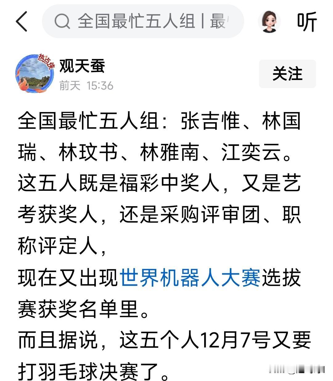 最忙五人组特大新闻,张吉惟,林国瑞,林玟书,林雅南,江奕云这五人会”分身”,在很多领域里来回扮演各种角色,他们一会是评委,一会又是又是中奖名单上的人,这些人的名字显然是照搬过来的,连顺序都没有变,名字是有了,在现实生活中有没有这五个人也是未知数。可见这五个人的名字是编造出来的。 为什么有人编造这些人的名字,就是为了钱,这五个人是评委是福彩中奖名单上的名字,也是书法比赛评委名单上的人,就是虚构各种比赛,各种评定,就连2023年福建警察学院提前批录取上都有这些人的名字。 就是编造的比赛评委席的名字,骗钱是真的,这就是在网上搜索出来的名字连顺序都没有改,作假做的太假了。