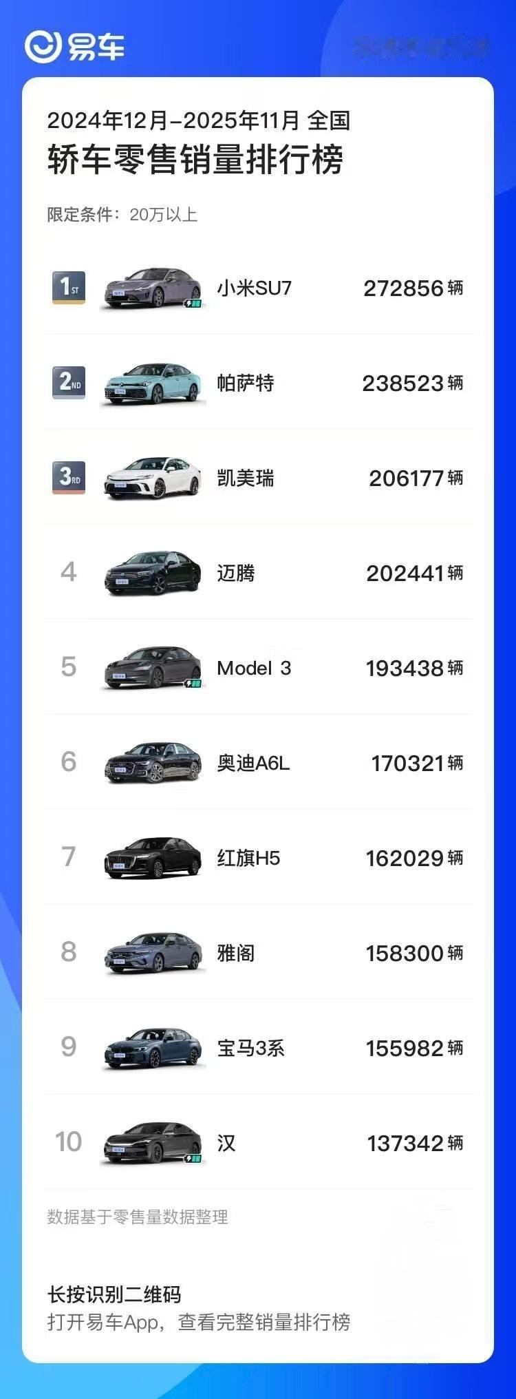 小米汽车销量与口碑双爆背后的核心逻辑小米三款新车齐曝光小米汽车11月交出46,349台的亮眼销量,其中YU7单车销量33,729台跻身无定语车型前十,乘联会数据印证其真实销量远超官方初步披露,终端高进店量与高转化率凸显市场认可度。SU7更稳坐20万以上市场冠军宝座近一年,不分能源类型的领先地位,加之定制服务顺利交付,彰显其线下渠道与产能推进的双重实力。这份成绩源于小米“十倍投入、技术深耕”的造车方法论。聚焦智能电动车五大核心技术底层研发,从易车、老章拆车的实测验证,到智驾领域57.9亿元首期投入与1800人专属团队的深耕,都印证了其“用心造车”的初心。产品力不仅俘获理性务实的精英用户群体,更凭借“全系顶配硬件+免费软件功能”的技术普惠路线,契合主流购车需求,爆款频出绝非偶然。全球层面,小米汽车已成为中国智造的新名片。MKBHD盛赞其“4.2万美元开出7.5万质感”,福特CEO将其列为最爱,黄仁勋称之为“奇迹”,宝格丽CEO类比苹果成就,海外顶级媒体与名人的集体背书,印证其产品力已实现对特斯拉的多维超越。国内销量用真金白银投票,海外口碑打破国际偏见,双重认可之下,小米汽车正以技术硬实力打破舆论杂音,在全球新能源赛道上确立中国品牌的核心竞争力。
